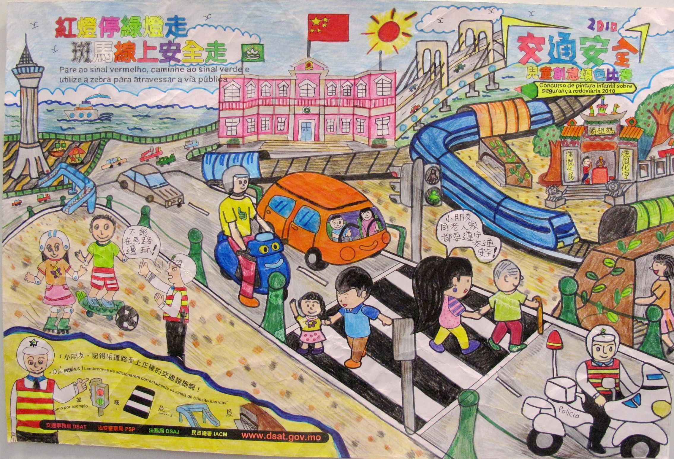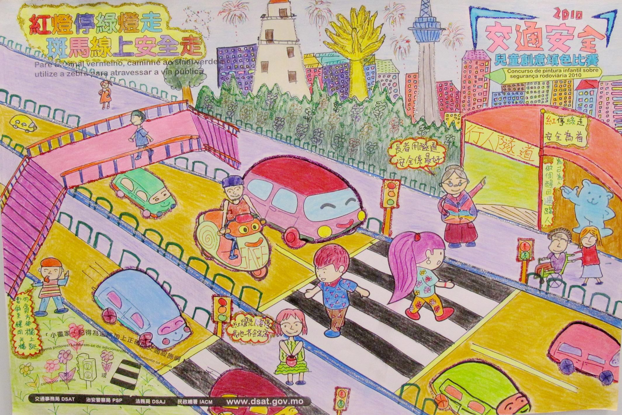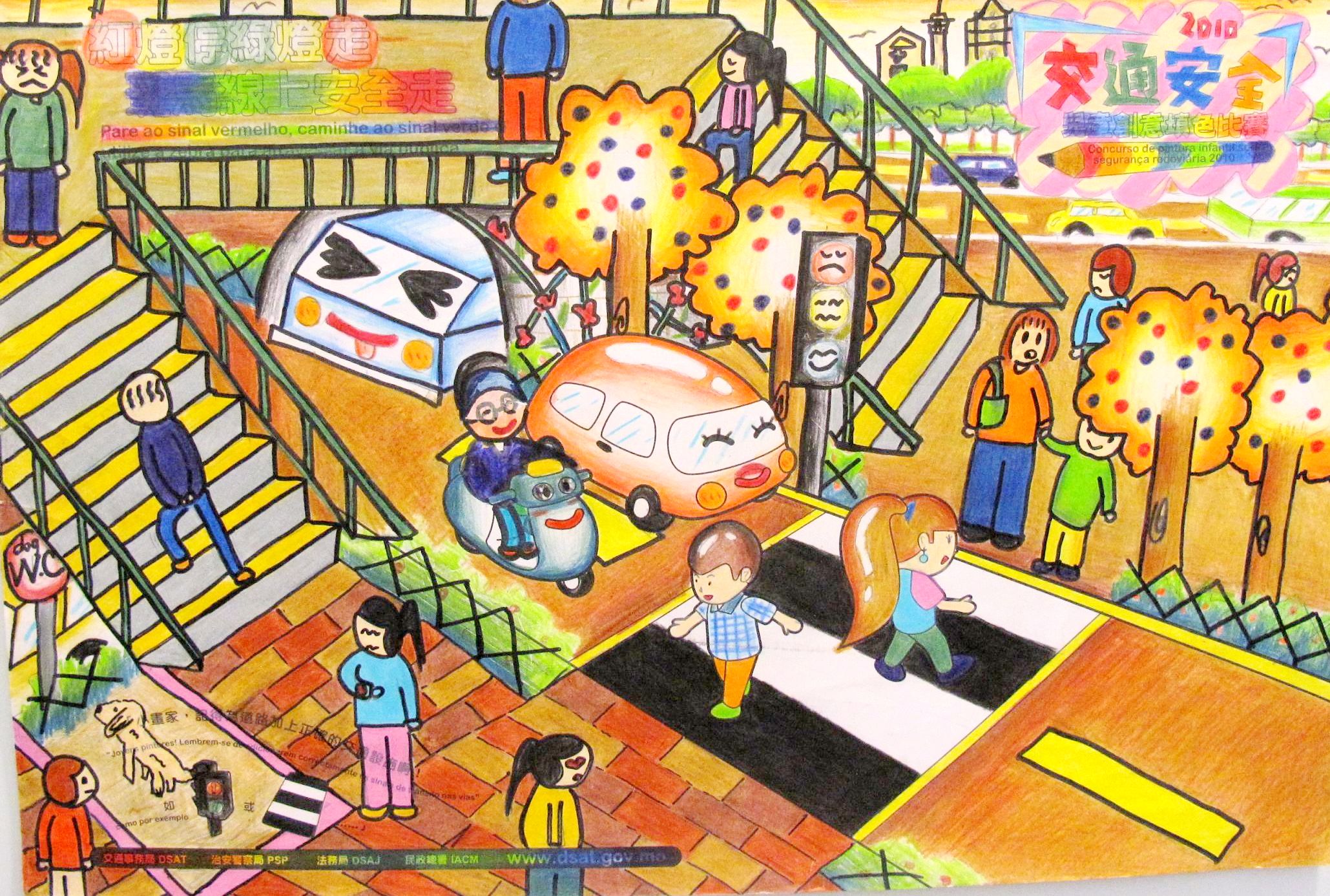 由交通事務局、治安警察局、法務局及民政總署合辦的“交通安全兒童創意填色比賽”,為“交通安全推廣月2010”的前奏活動之一,比賽以“紅燈停綠燈走,斑馬線上安全走"為主題,宣揚交通安全的重要性,鼔勵兒童自小養成守法有禮的橫過馬路習慣。比賽分為三個組別,分別是A(4-6歲)、B(7-9歲)及C(10-12歲)組,合共收回4,447份參賽作品,較去年增加600多份。