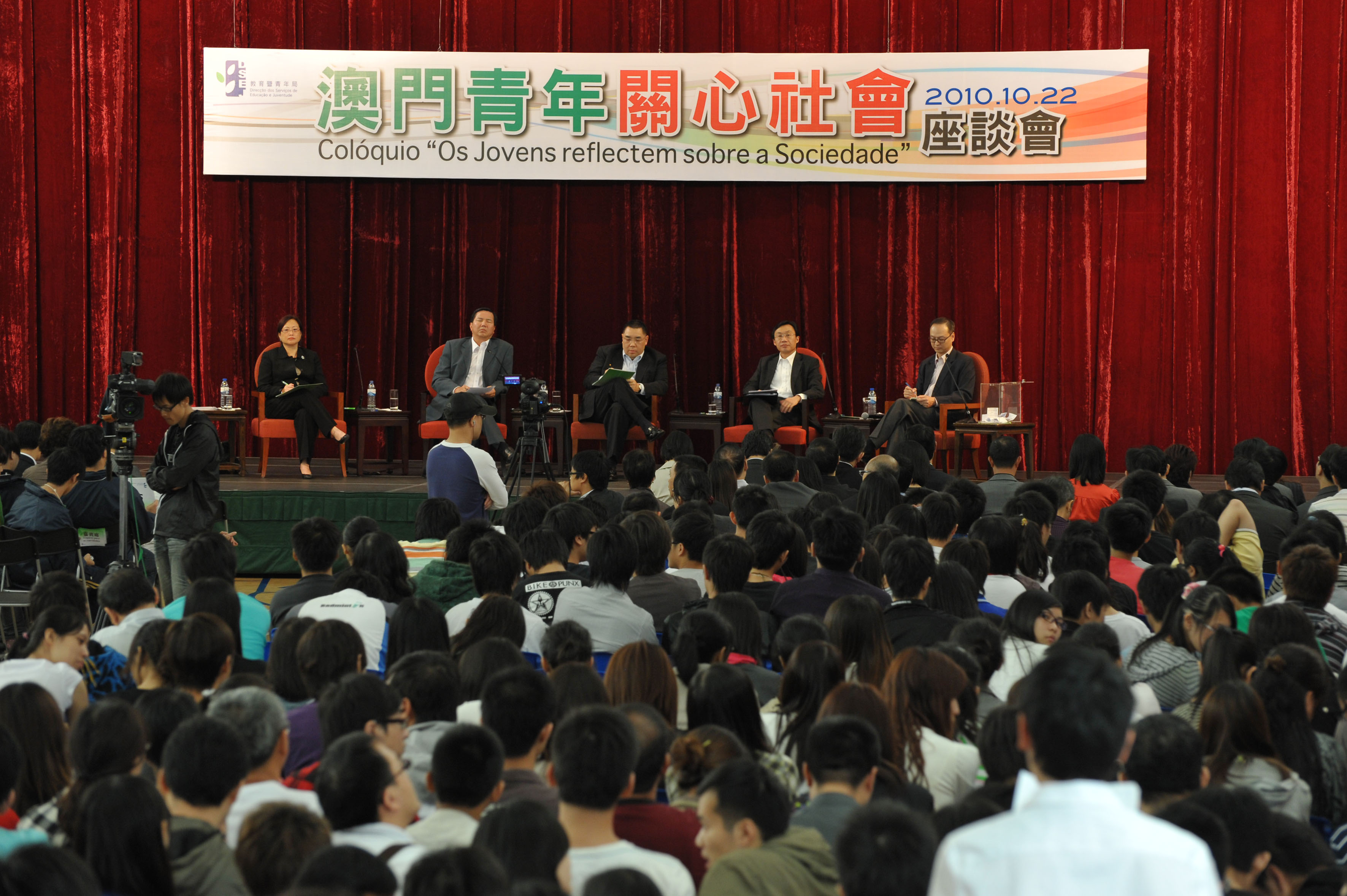 為了進一步加強特區政府與青年的溝通,鼓勵青年關心社會發展並積極表達意見,教育暨青年局於本年10月22日(星期五)晚上8時至10時,在何東中葡小學體育館舉行了主題為“青年如何配合本澳適度多元發展”的“澳門青年關心社會”座談會。當晚主辦單位特別邀請了行政長官崔世安博士、社會文化司張裕司長、行政長官辦公室譚俊榮主任、社會文化司司長辦公室張素梅主任、教育暨青年局蘇朝暉局長以及多位政府部門的領導及代表到場與青年面對面交流,深入了解青年的想法和需要,以作為制定有關政策的參考。