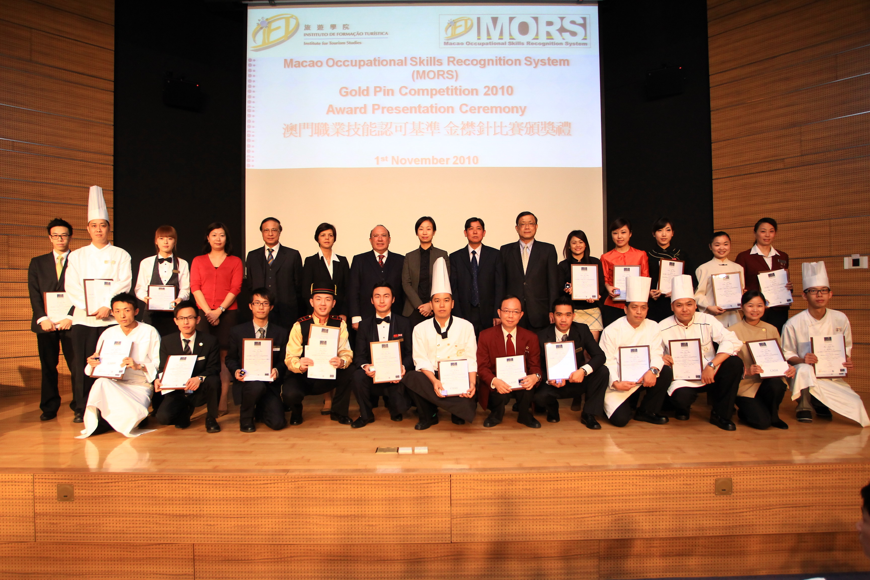 旅遊學院於11月1日舉行『澳門職業技能認可基準』(MORS) 2010金襟針大賽頒獎典禮,由旅遊局局長安棟樑工程師、勞工事務局職副局長林美美女士、酒店業協會會長陳健文先生及澳門酒店旅業職工會會長李寶來先生擔任頒獎嘉賓。