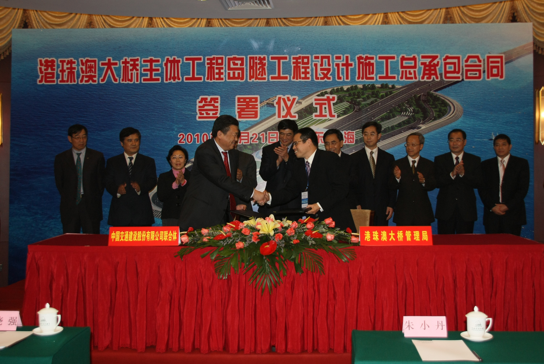 另悉,今日,港珠澳大橋管理局局長朱永靈和中國交通建設股份有限公司聯合體代表中交公司總裁劉起濤簽署了港珠澳大橋島隧工程設計施工總承包合同。該工程中標價131億元,是整個大橋最核心、最關鍵的工程。目前,島隧工程開工前的各項工作已準備就緒,上百名管理人員和設計團隊已逐步到位,施工設備已陸續進場,港珠澳大橋主體工程建設的關鍵戰役即將打響。