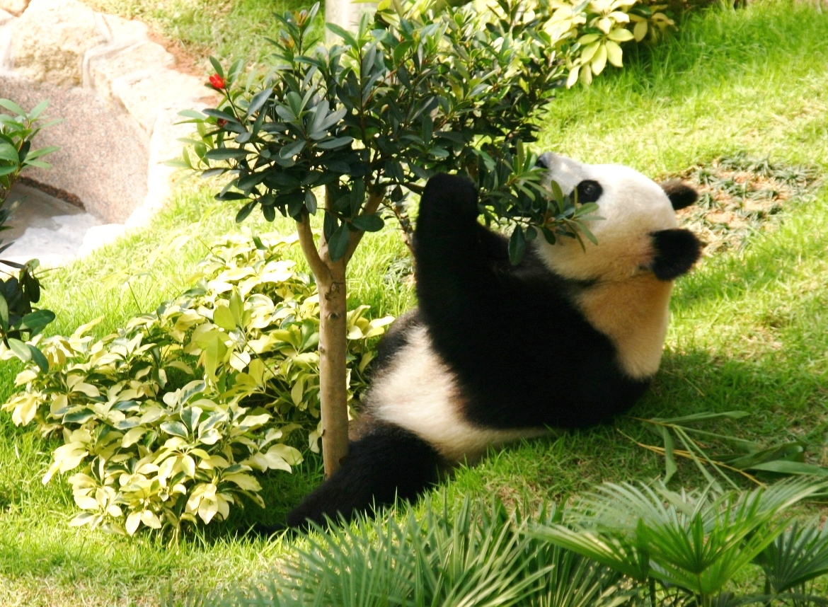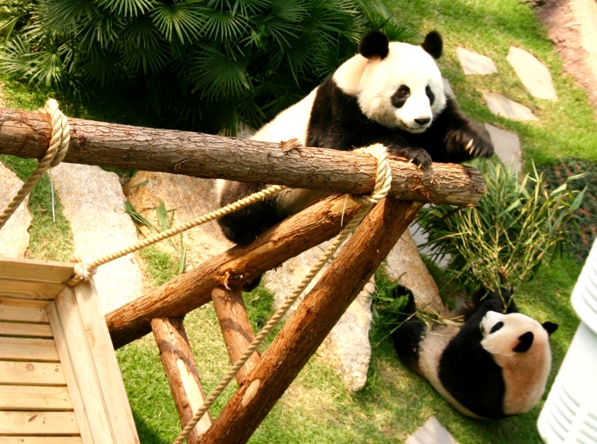 一對大熊貓對室內活動區的各項設施表現出相當有興趣,尤其是木鞦韆,在上面蕩來蕩去玩個不亦樂乎。活潑好動的“開開”最喜歡在鞦韆架上展現靈巧的身手,不斷地爬上爬下;較文靜的“心心”則很喜歡軟綿綿的草地,不時在上面翻筋斗,或是舒暢地躺下。大熊貓“開開”、“心心”似乎很快喜歡上這個新場地,不時扭作一團玩耍非常開心,累了便坐下來專心吃竹子,並把下半身浸進水池中納涼。