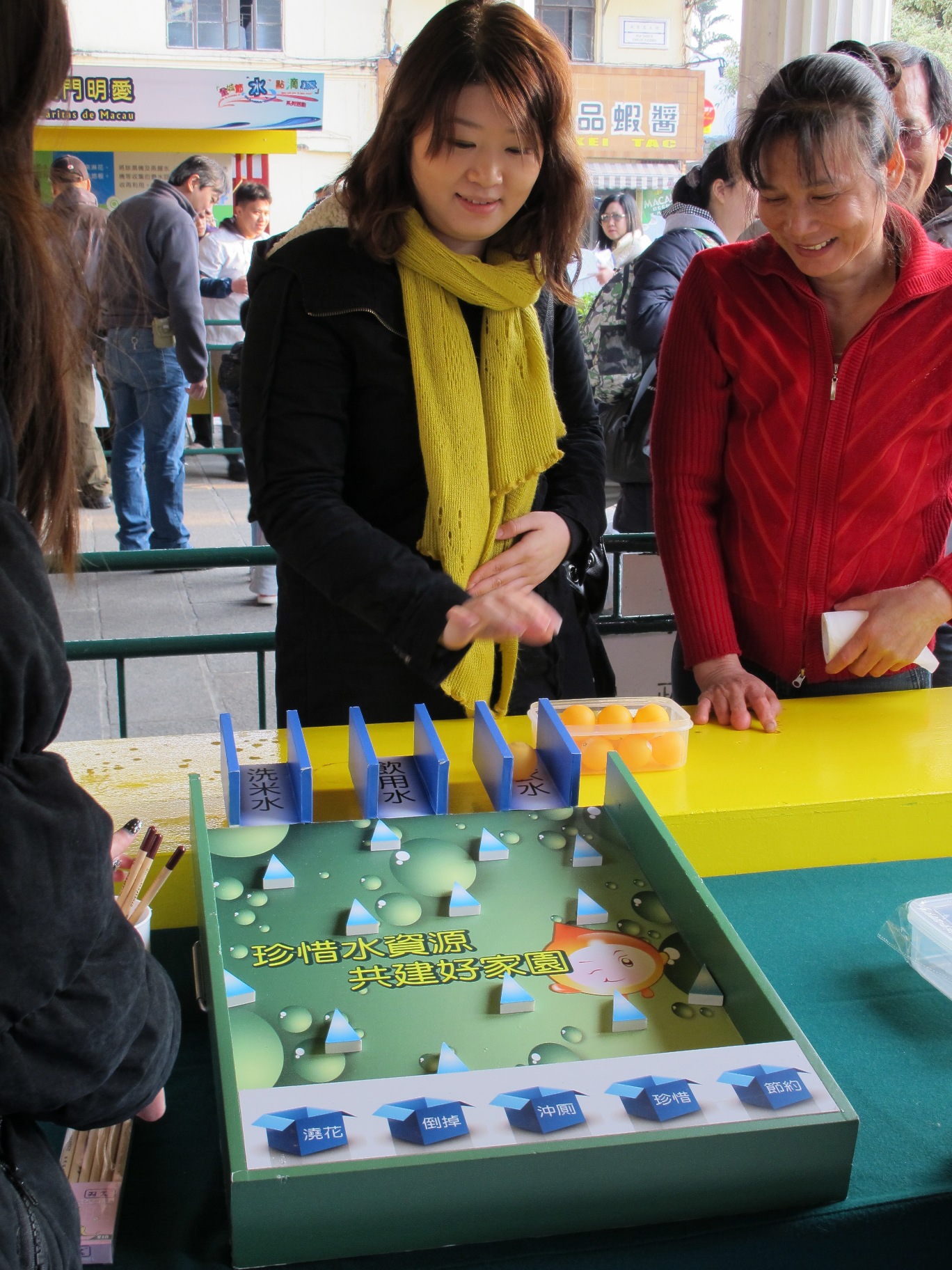 今日下午二時半至五時,小組在氹仔嘉模墟設置多個以節水為主題的攤位遊戲,參加遊戲的市民獲贈由小組送出的節水器具及精美紀念品;現場亦有專人示範和播放宣傳短片,教導市民認識節水器具的安裝方法及其節水效能,以推廣節水器具的使用,同場亦展出了水資源現況及節水方法等展板。