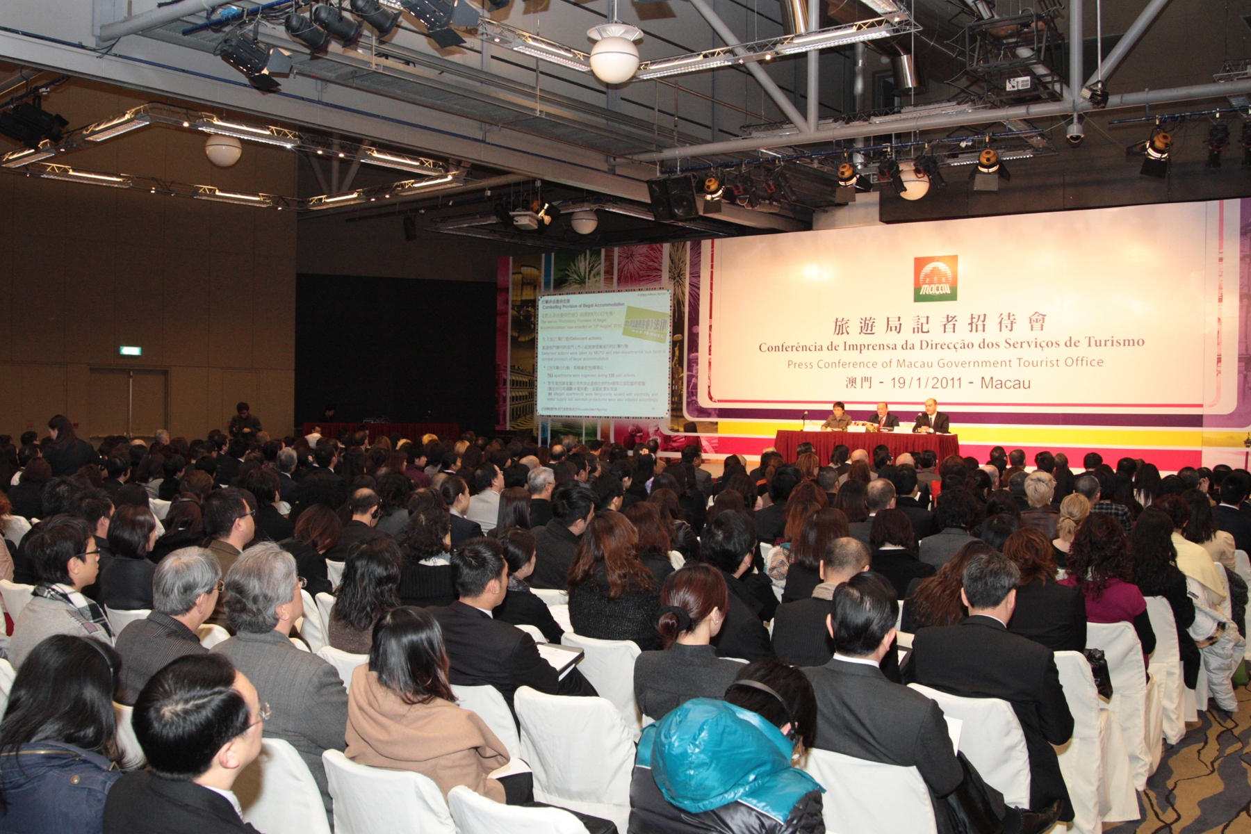 澳門特區政府旅遊局年度記者招待會今(十九日)在澳門旅遊塔會展娛樂中心舉行。澳門特區政府旅遊局局長安棟樑會上回顧去年旅遊業情況並介紹今年發展計劃和市場推廣活動。旅遊局駐外代表、業界及國際和本地媒體代表近四百人出席(粵港澳及外地駐港澳傳媒約一百人)。
