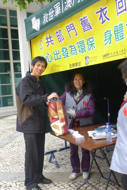 為了讓各級公務人員以及酒店從業員能親身參與各項環保工作,體驗環保的意義,達致“從心出發為環保;身體力行齊參與” 的目的。考慮到基於潮流、換季等等因素,每年均產生大量的舊衣物;基此,環境保護局聯同行政暨公職局以及救世軍(澳門)在去年12月份分別舉辦了面向公共部門以及環保酒店的舊衣回收行動。同時,主辦單位亦於去年12月16日和30日在宋玉生公園以及友誼廣場設置兩個公共舊衣回收點,以方便有興趣的市民能參與及支持舊衣回收工作。