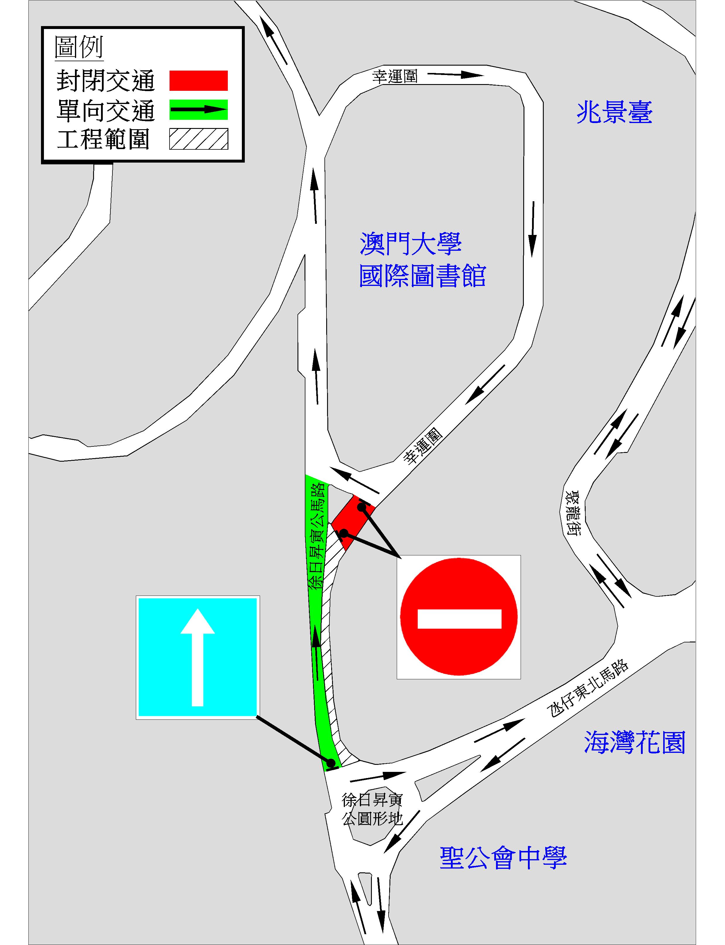配合澳門電力股份有限公司開展的電纜鋪設工程,由本月25日(周一)至5月6日,介乎徐日昇寅公圓形地與幸運圍之間的一段氹仔徐日昇寅公馬路將臨時改作單向通車,車輛只能由徐日昇寅公圓形地往幸運圍方向行駛,同時將禁止車輛由幸運圍左轉入氹仔徐日昇寅公馬路。此外, 介乎黑沙兵房路與竹灣豪園之間的一段路環竹灣馬路則於本月25日至5月9日期間實施有限度通車。