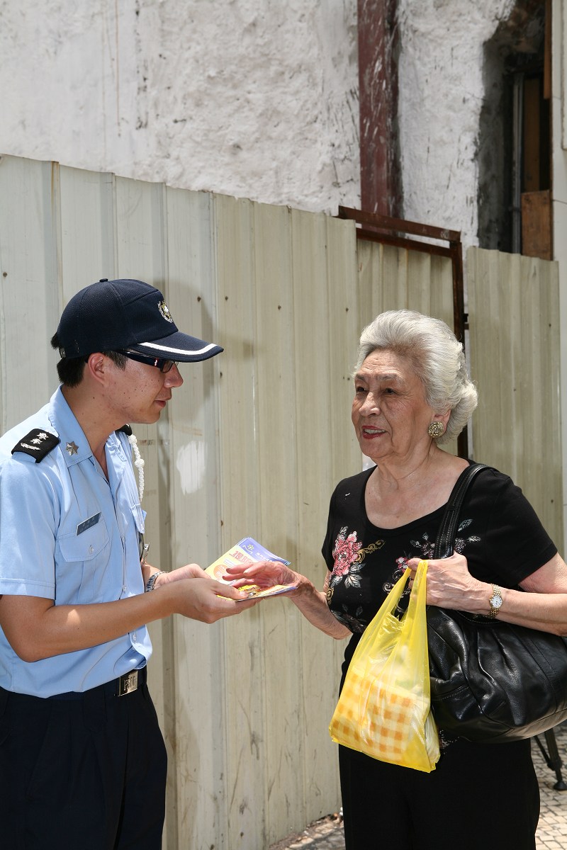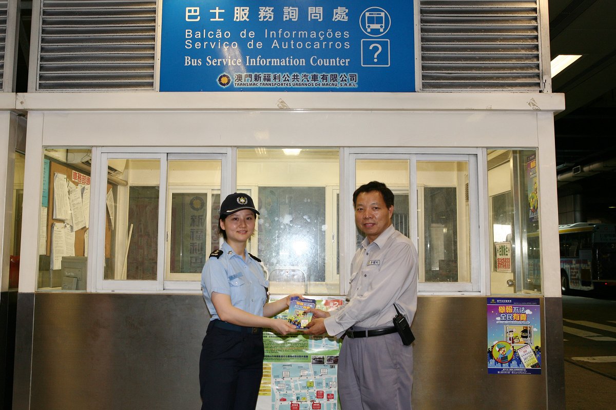 今天早上11時30分,本局公共關係處源劍鋒副警司及鍾倩怡副警司、連同第一警務警司處馮長全副警司到新馬路一帶巴士站進行防扒竊宣傳工作,向候車乘客派發“提防小手”小冊子、講解常見的犯罪手法、提醒在乘車或候車期間應注意自身財物的安全,並即場對財物外露的候車人士作出溫馨提示,讓其了解正確的保管財物方法。除此之外,亦向巴士站附近商鋪的店員作出呼籲,若發現可疑人士應立即通知本局處理。其後,宣傳小組人員移師關閘廣場下層巴士總站繼續進行宣傳活動,更在多個站點當眼處張貼防罪海報,以及向各站長呼籲在巴士靠站期間,加強留意形跡可疑的人士,適時提醒乘客注意財物安全,有需要可報警求助。同類的宣傳活動稍後將繼續在離島區進行。