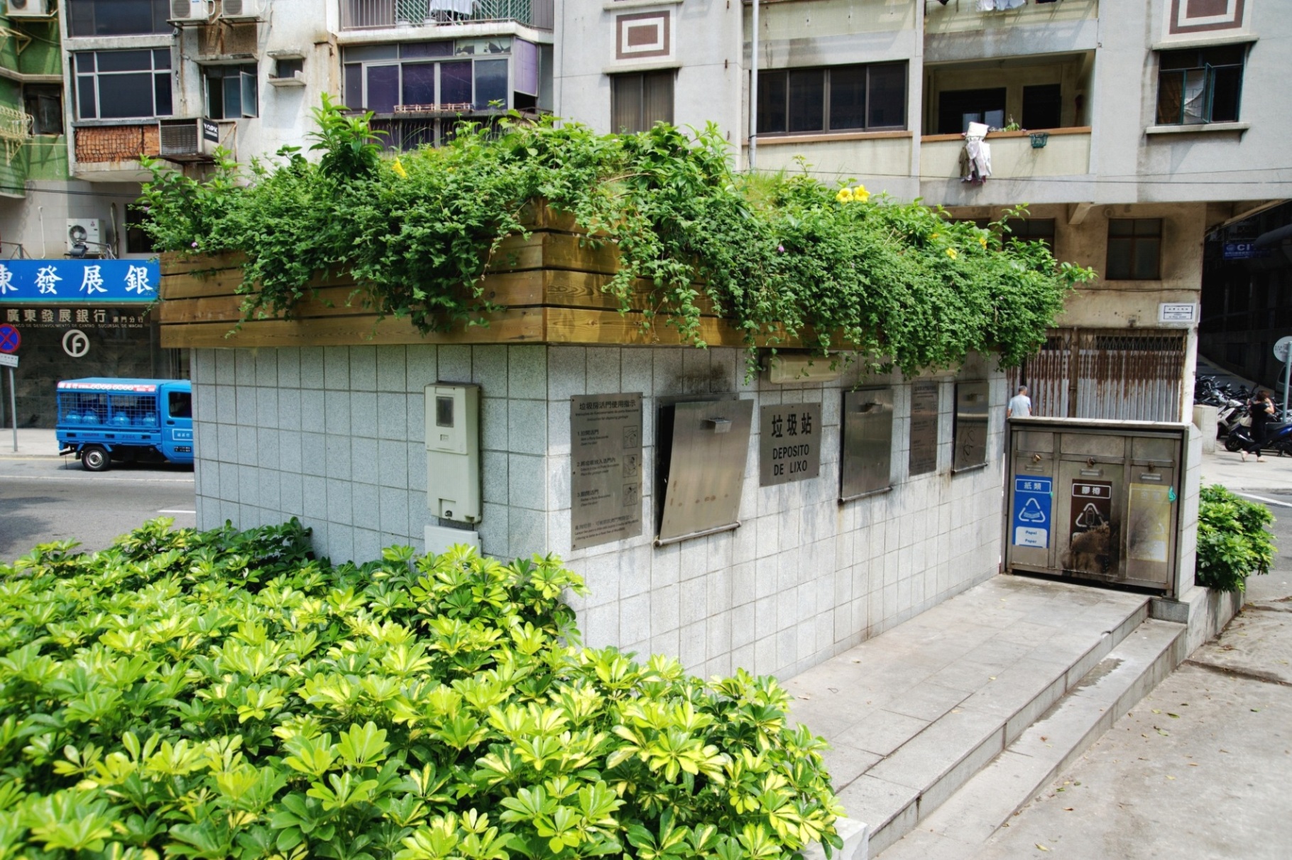 今年初完成了五個垃圾房頂的綠化和加設一道綠涼棚,其中三個垃圾房在中區南灣大馬路一帶鬧市,另外兩個在路環舊城區內,而綠涼棚則設置在氹仔舊城區。有關垃圾房的綠化是透過採用掛盆方式,在垃圾房頂擺設花盆及安裝滴灌灑水系統,節省人力及用水量。盆內種植了簕杜鵑、軟枝黃嬋及紫花馬纓丹等多個品種,形態、花色及花期各異,特意設計在全年大部份時間都長滿了青翠綠葉及開著鮮艷的花朵。將原本不起眼的垃圾收集設施進行綠化改造,使之成為澳門城市綠化的一個特色。