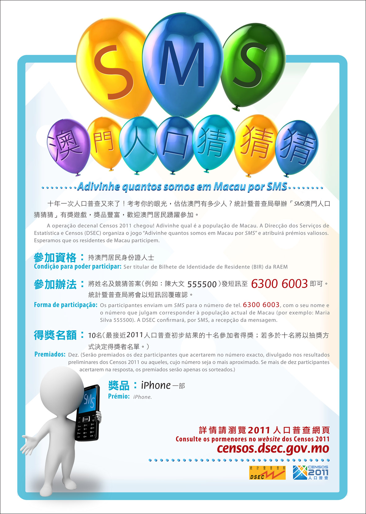 你知道澳門人口有多少嗎?統計暨普查局誠邀全澳門居民參加「SMS澳門人口猜猜猜」有獎遊戲。猜中的居民有機會贏取iPhone大獎,獎額10名。