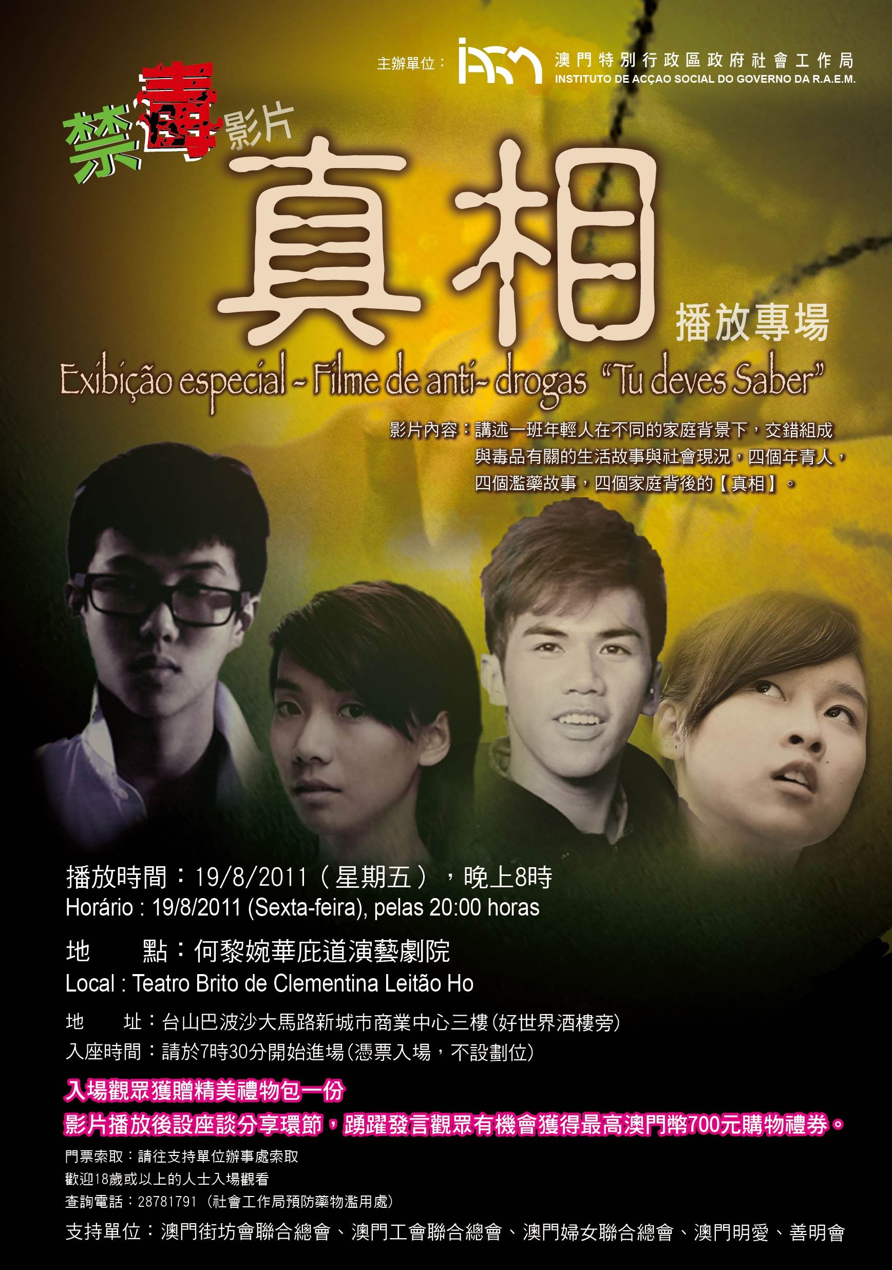 由社會工作局製作、澳門青年挑戰協助籌劃拍攝的禁毒影片«真相»,將於8月19日(星期五)晚上8時,假台山巴波沙大馬路新城市商業中心三樓的何黎婉華庇道演藝劇院進行專場播映。這齣影片以「真相」命名,其劇本是由多個真實個案改編而成,內容講述四個來自不同家庭背景的年青人,因著不同的原因以及複雜的社會問題,導致他們接觸毒品,甚至染上了毒癮。影片通過寫實的故事情節,引導觀眾從不同的角度去剖析毒品問題,了解吸毒所帶來禍害,加深公眾對抗毒工作的認受性。