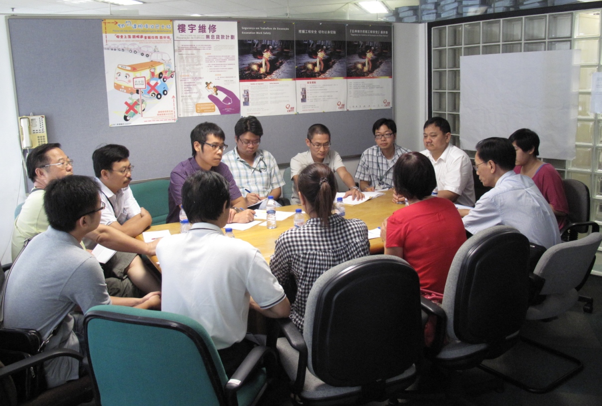 街總大廈管理資源中心主任陳溥森、街總北區辦事處主任周宜心、馬場黑沙環祐漢新村居民聯誼會理事長鄭麗霞等一行人日前到訪土地工務運輸局,主要反映東北區的舊樓失修問題,由城市建設廳代廳長梁俊佳、監察處代處長李建豐等接見。