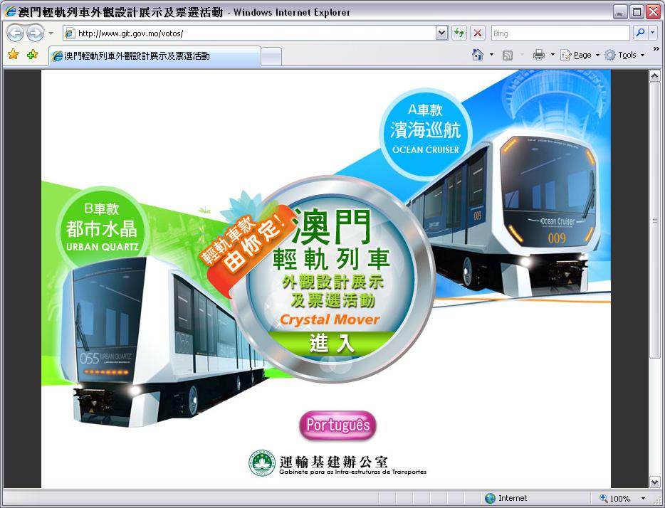 除了戶外展覽外,市民也可以登入票選活動專題網頁(www.git.gov.mo/votos)瀏覽列車設計簡介,並於9月3日(本周六)凌晨開始進行投票,此外,市民還可於展覽現場、運輸基建辦公室、民署轄下的中區服務站、下環服務站、台山服務站、北區市民服務站及離島市民服務站索取投票表格,填寫後投放到設於上述地點的投票箱。參與投票的市民更可以參與抽獎。