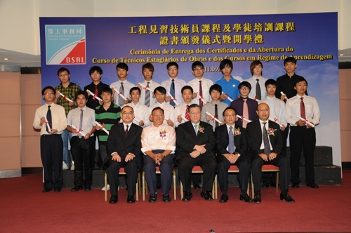 典禮上另一項課程是兩年全日制的「學徒培訓課程」,是勞工事務局專為由14至24歲,具初三畢業程度的青少年而設的職前培訓課程,培訓總時數達3,664小時,課程內容十分充實。「學徒培訓課程」的學員除了學習專業技能及一般文化科目外,並獲安排於公共事業機構、政府部門或企業進行400多個小時的密集式專業實習,透過理論及實習進行交替培訓,讓學員將課堂所學的理論和操作知識融合在實務情境,切實掌握專業技能及提升就業競爭力。局長孫家雄表示今屆學徒培訓課程的畢業學員有52人,人數為歷屆之冠。在過往十多屆課程共為就業市場培訓了500多名技術人員,畢業學員的就業情況理想,部份更已晉身管理階層,可見課程的教學素質及學員的技能水平深獲業界的肯定及認同。