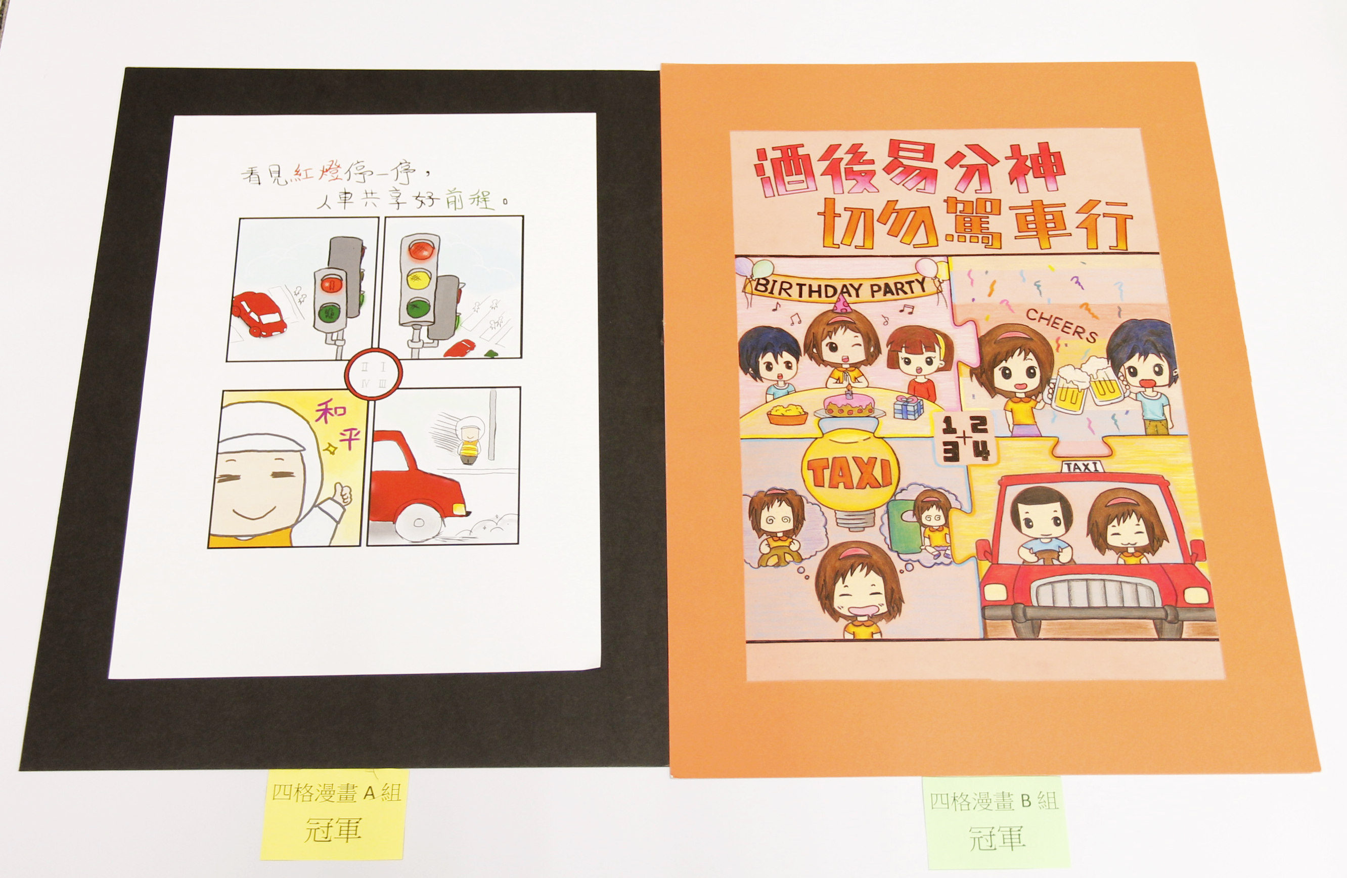 “交通安全四格漫畫及口號創作比賽"A組:冠軍李倩琳、亞軍黃慧儀、季軍許麗、殿軍范穎珊,優異獎五名分別為李穎晴、傅瑞盈、鄧曉欣、岑妙婷、梁凱晴;B組:冠軍勞敏儀、亞軍楊寶儀、季軍梁麗美、殿軍古慧雯,優異獎五名分別為劉明莉、許亦媚、歐詠詩、黃詠艷、陳惠善。