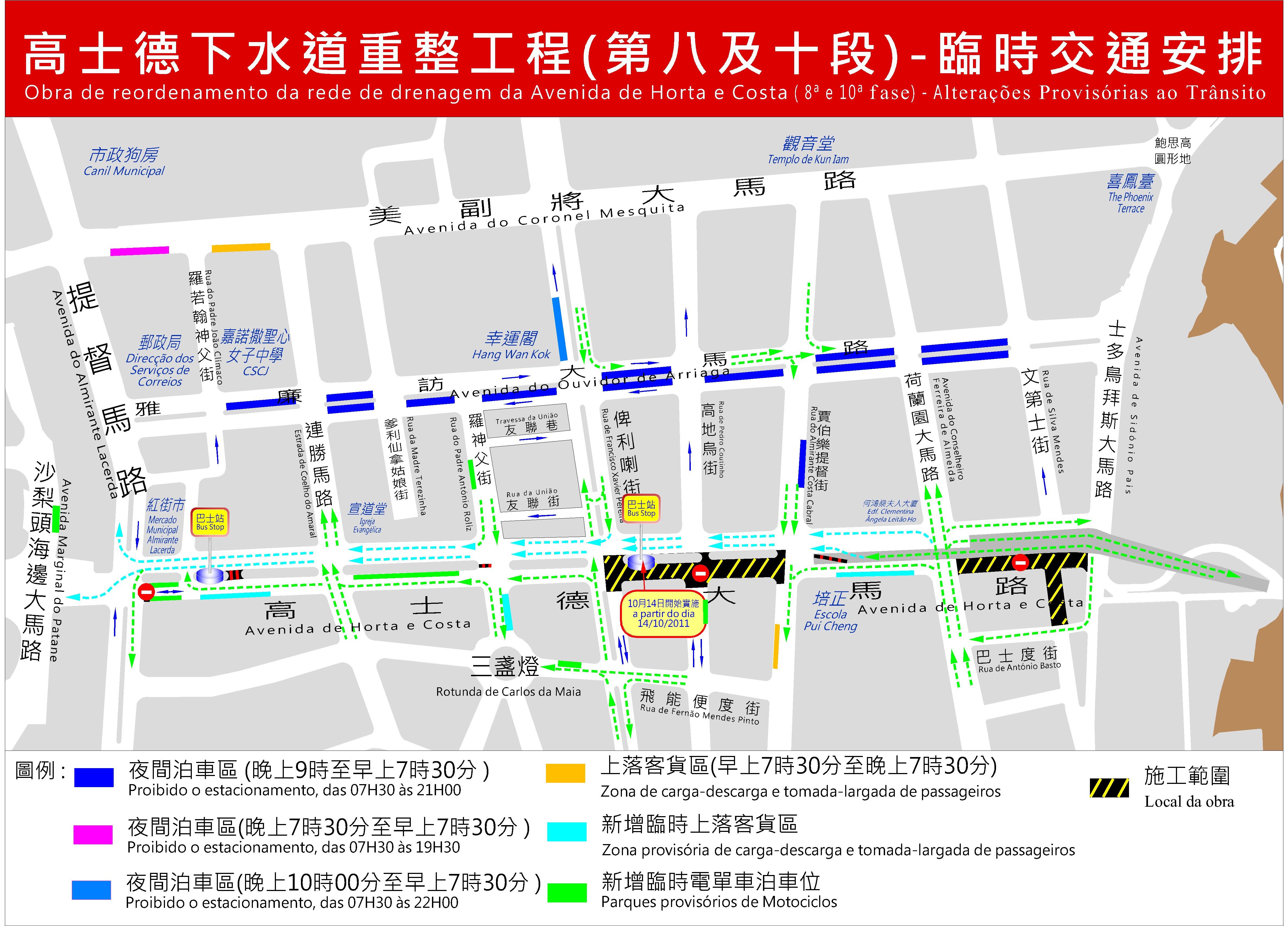配合高士德大馬路下水道第八段重整工程施工,位於高士德大馬路與高地烏街交界口、即綠化帶之間的臨時巴士站,將於明日(14日)起再向紅街市方向遷移約55米,即高士德大馬路近華暉閣(中國銀行)對出的中間安全島位置,相關位置的斑馬線亦會重開,以回應行人往來巴士站的需要。