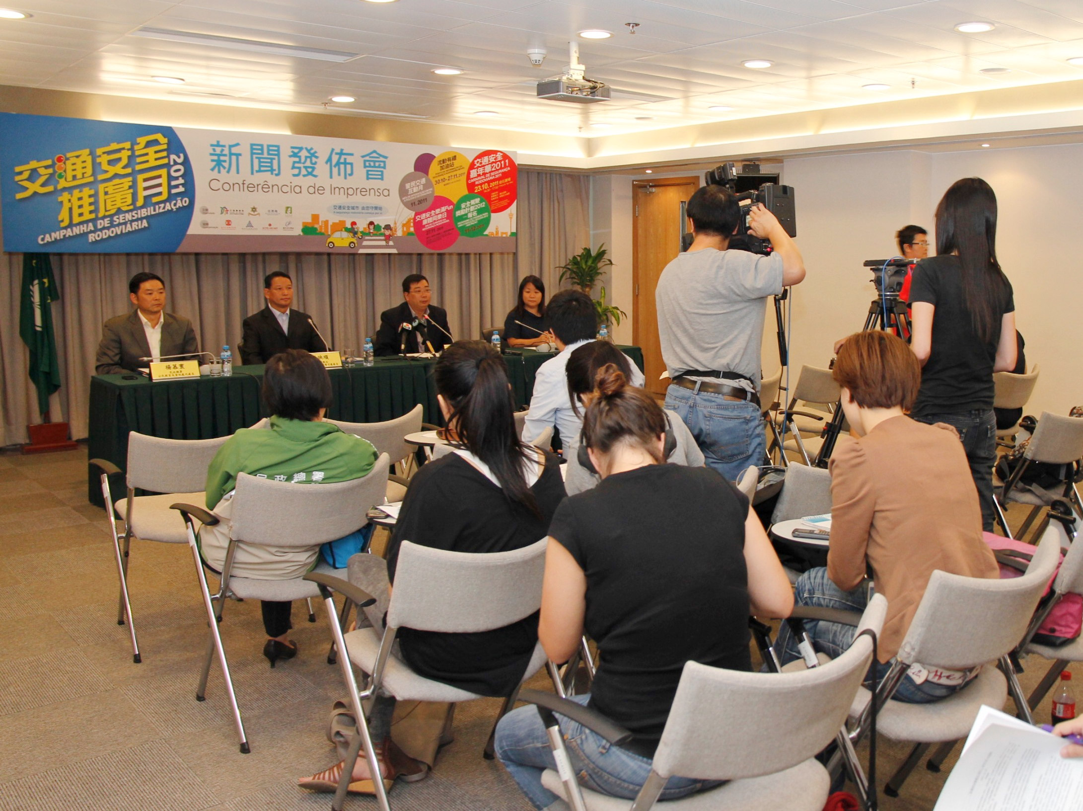 由交通事務局、治安警察局、法務局及民政總署合辦,澳門工會聯合總會、澳門街坊會聯合總會、澳門婦女聯合總會及澳門少年警訊協辦的「交通安全推廣月2011」將於本月23日至11月30日舉行,主辦單位今日(18日)假交通事務局多功能廳舉行新聞發佈會,由交通事務局副局長鄭岳威、治安警察局交通廳交通監控警司處處長張映順、法務局法律推廣廳廳長羅靜萍及民政總署公民教育及資訊處代處長楊慕寰介紹活動詳情。
