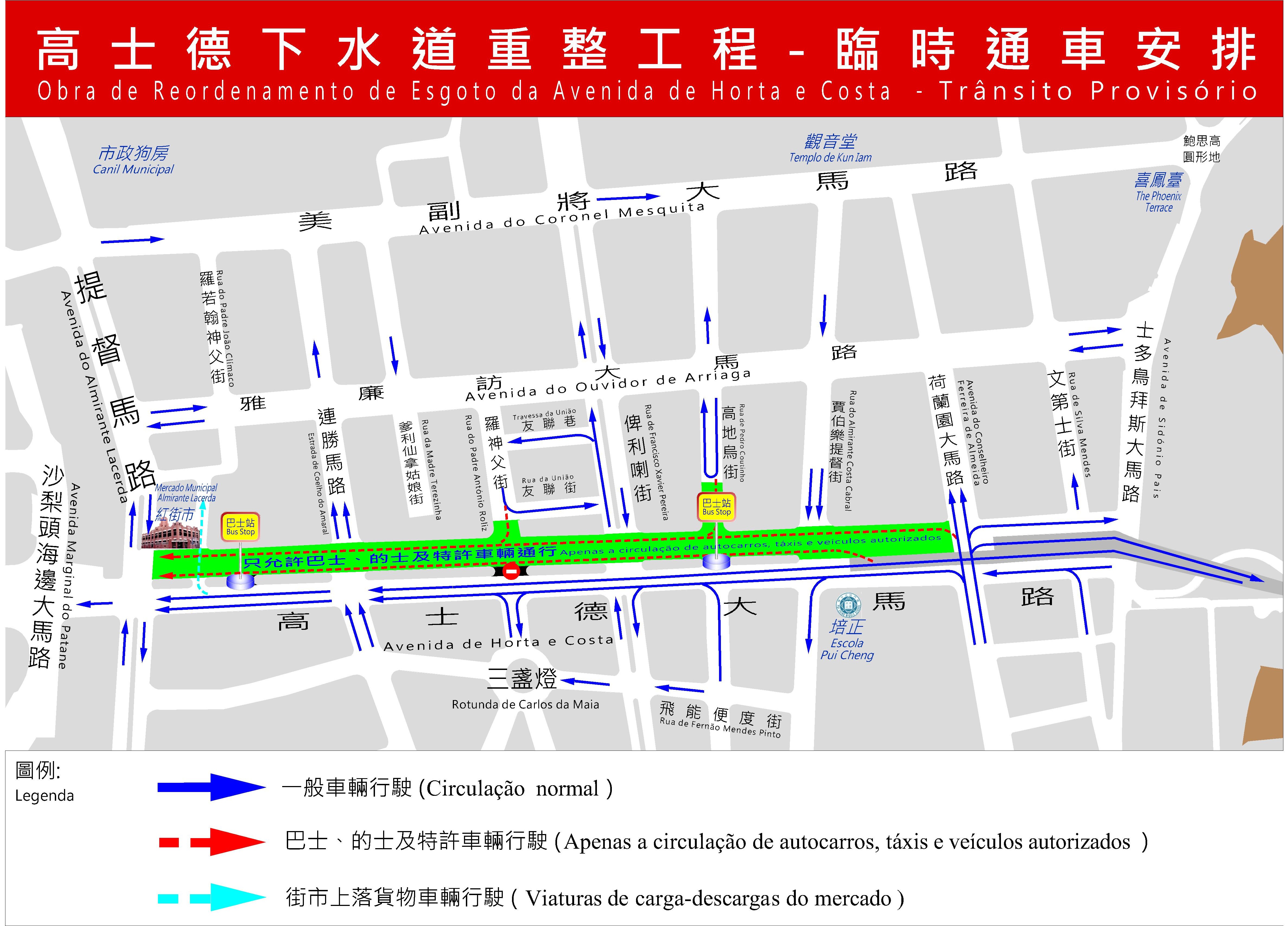 此外,交通事務局將結合路口轉向簡化,於高士德大馬路主要路口設置臨時交通燈,以理順人車通行秩序,提升行人過路安全。同時,原設於賈伯樂提督街、高地烏街、俾利喇街、姑娘街及連勝馬路近高士德大馬路路口的上落客貨區域則予以保留。