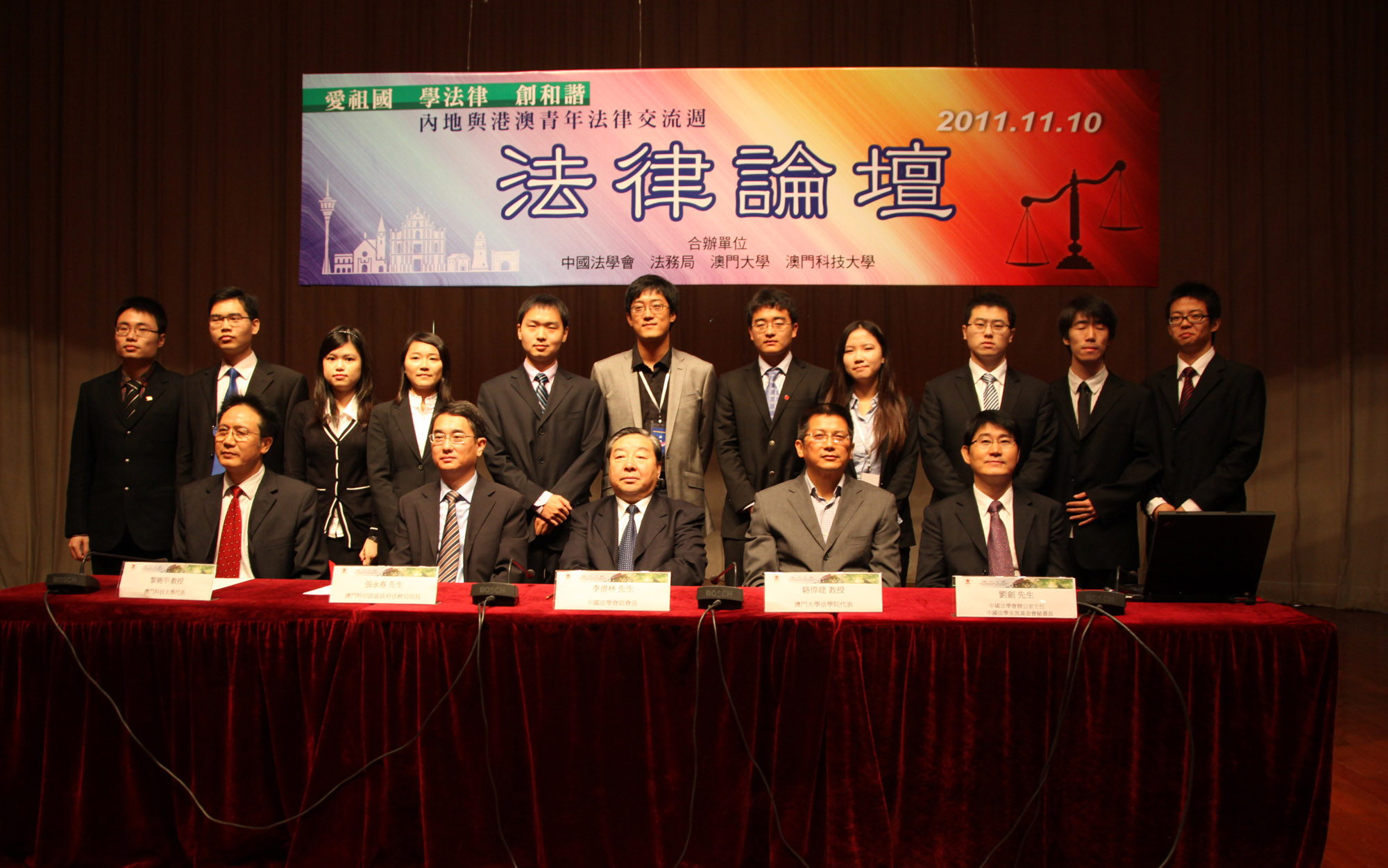 “愛祖國、學法律、創和諧”內地與港澳青年法律論壇由中國法學會、澳門特區法務局、澳門大學、澳門科技大學合辦,於昨日上午十時假澳門大學圖書館STDM演講廳開幕。由中國法學會副會長李清林、澳門特區法務局局長張永春,中國法學會辦公室主任劉劍,澳門大學駱偉建教授,以及澳門科技大學黎曉平教授主禮。
