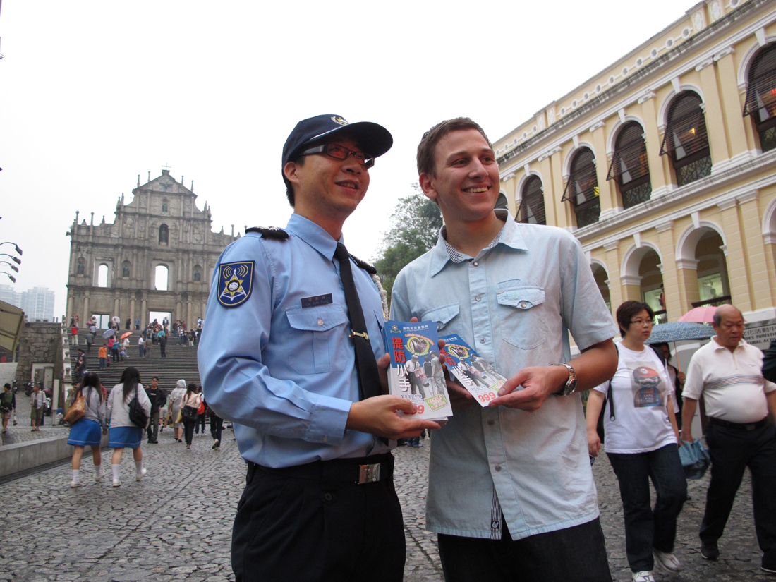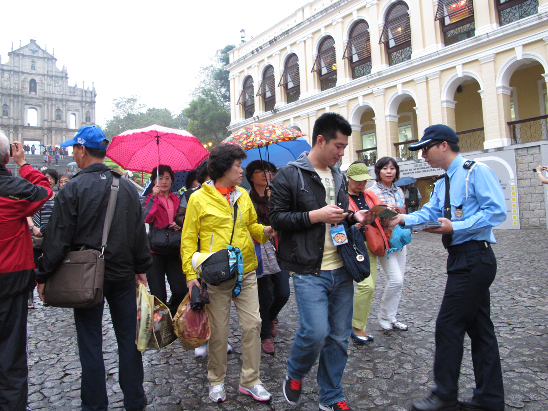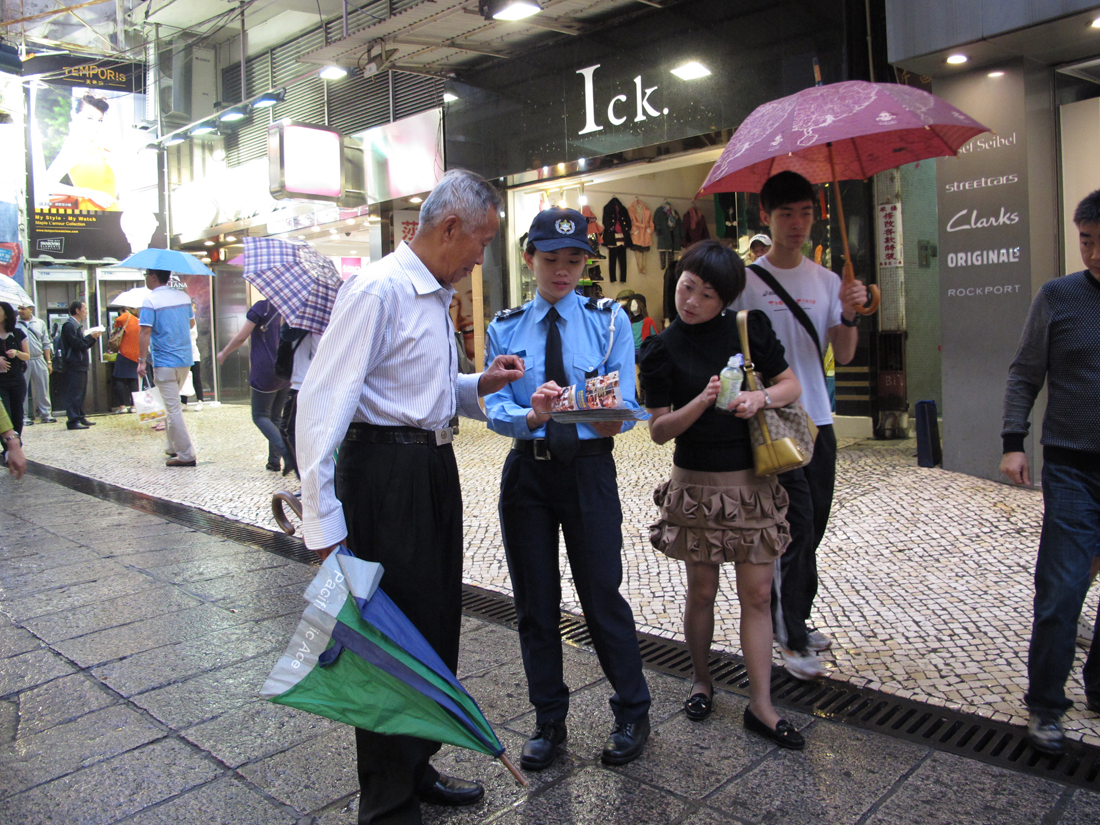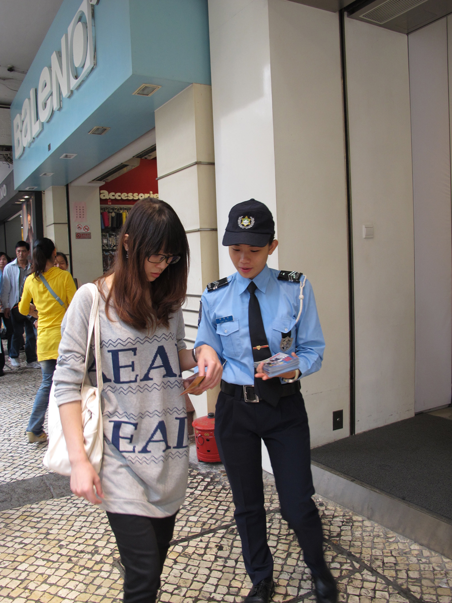 今天下午三時三十分,本局公共關係處源劍鋒副警司及鍾倩怡副警司、連同第一警務警司處陳德平警長等人,到議事亭前地、板樟堂及大三巴牌坊一帶進行防扒及防店鋪盜竊宣傳活動。期間,宣傳隊向居民及遊客派發“提防小手”小冊子,講解常見的犯罪手法,並即場對財物外露的人士作出溫馨提示,讓其了解正確保管財物的方法;亦向周邊的商鋪進行防店鋪盜竊宣傳,講解店鋪防盜的注意事項,並向店員派發防罪海報,提醒店員關於賊人的作案手法,特別在人多擠迫的時候提高警覺,以及適時提醒顧客注意個人財物安全,在有需要時應報警求助。