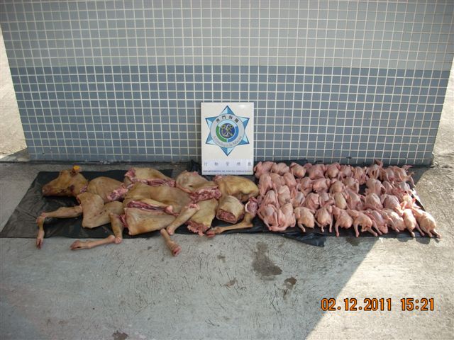 澳門海關接獲市民舉報,在麻子街有食肆進口未經撿疫的肉類作為餸菜材料,並售予公眾。經過多回監視,今天(2011年12月2日)下午,海關人員採取行動,成功緝獲已宰鮮已宰鮮羊頭和羊肉共重約:24公斤,已宰鮮乳鴿40隻共重約:18公斤。事件中一名吳姓本澳男子被帶往海關總部協助調查。