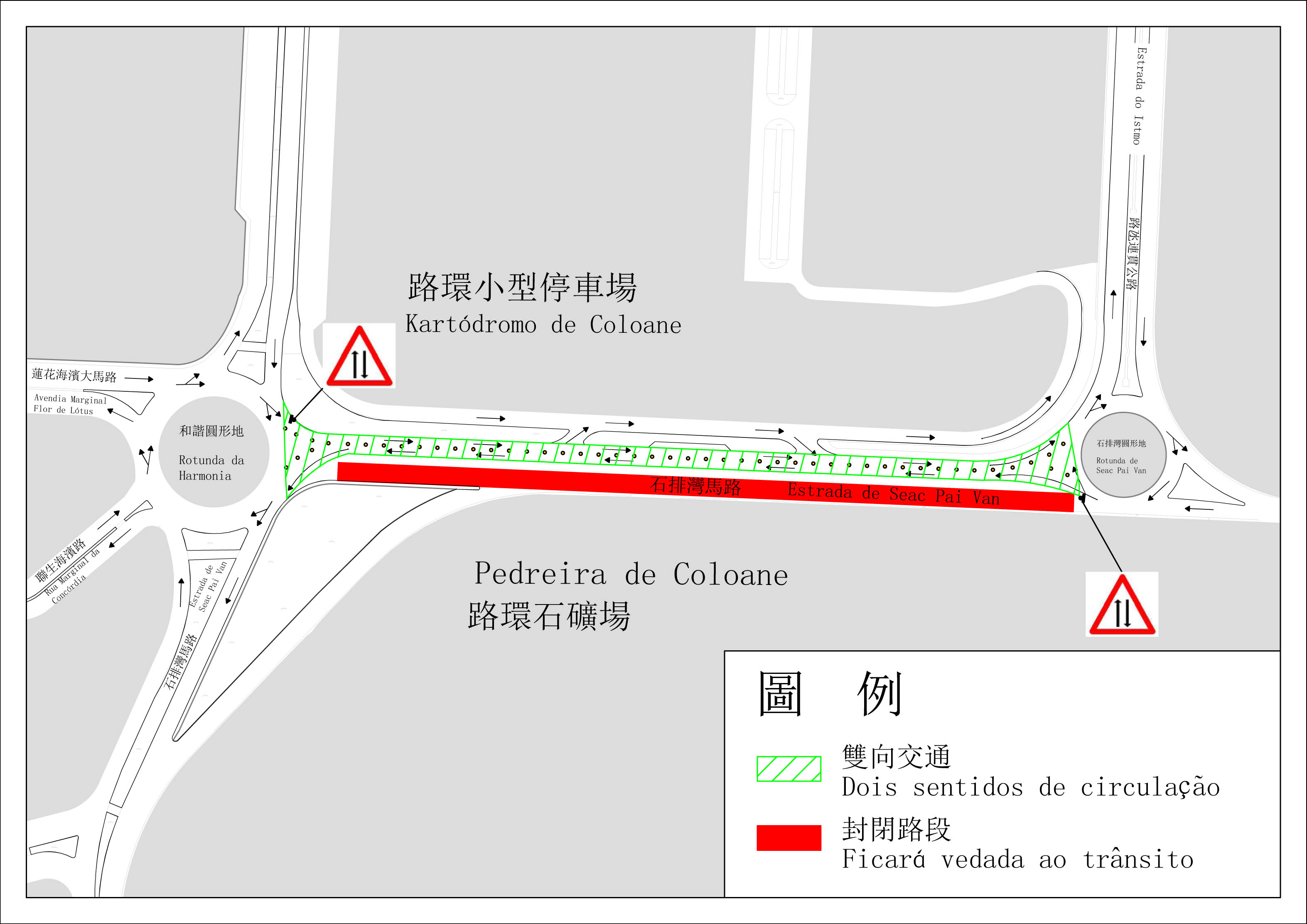 因應路環的發展需要,土地工務運輸局現正於路環開展下水道整治工程,配合有關工作,介乎和諧圓形地與石排灣圓形地之間的一段石排灣馬路靠向石礦場一側,將於本月31日(周二)早上11時起封閉交通,至於介乎和諧圓形地與石排灣圓形地之間的一段石排灣馬路靠向路環小型賽車場一側,將臨時改作雙向通車。與此同時,石排灣馬路近石礦場之巴士站亦將臨時停用,乘坐15、21A、25、26、26A、50及N3路線的乘客可改於“和諧圓形地"站上落。上述臨時交通改動措施為期120日。