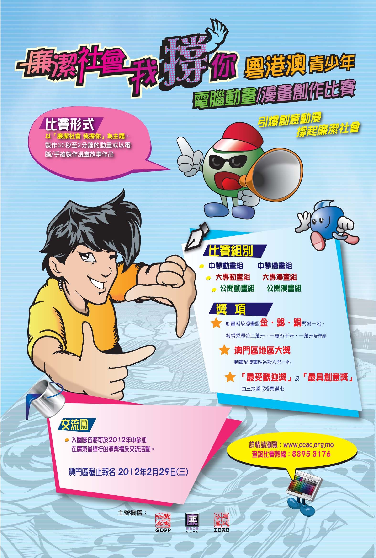 澳門廉政公署與廣東省人民檢察院、香港廉政公署合辦「粵港澳青少年電腦動畫及漫畫創作比賽」,由於三地青少年反應熱烈,粵、港、澳三地同時將截止報名日期調整至2012年2月29日,至於提交作品的限期即3月31日則維持不變。