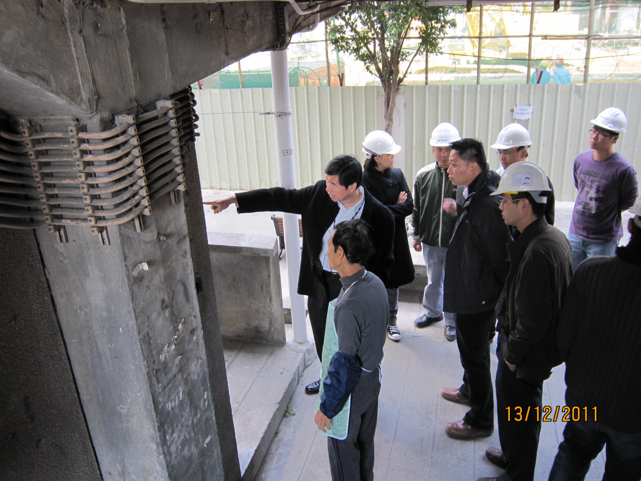• 建設辦主任陳漢傑於2011年年底與工程人員實地視察公務員大廈結構問題。