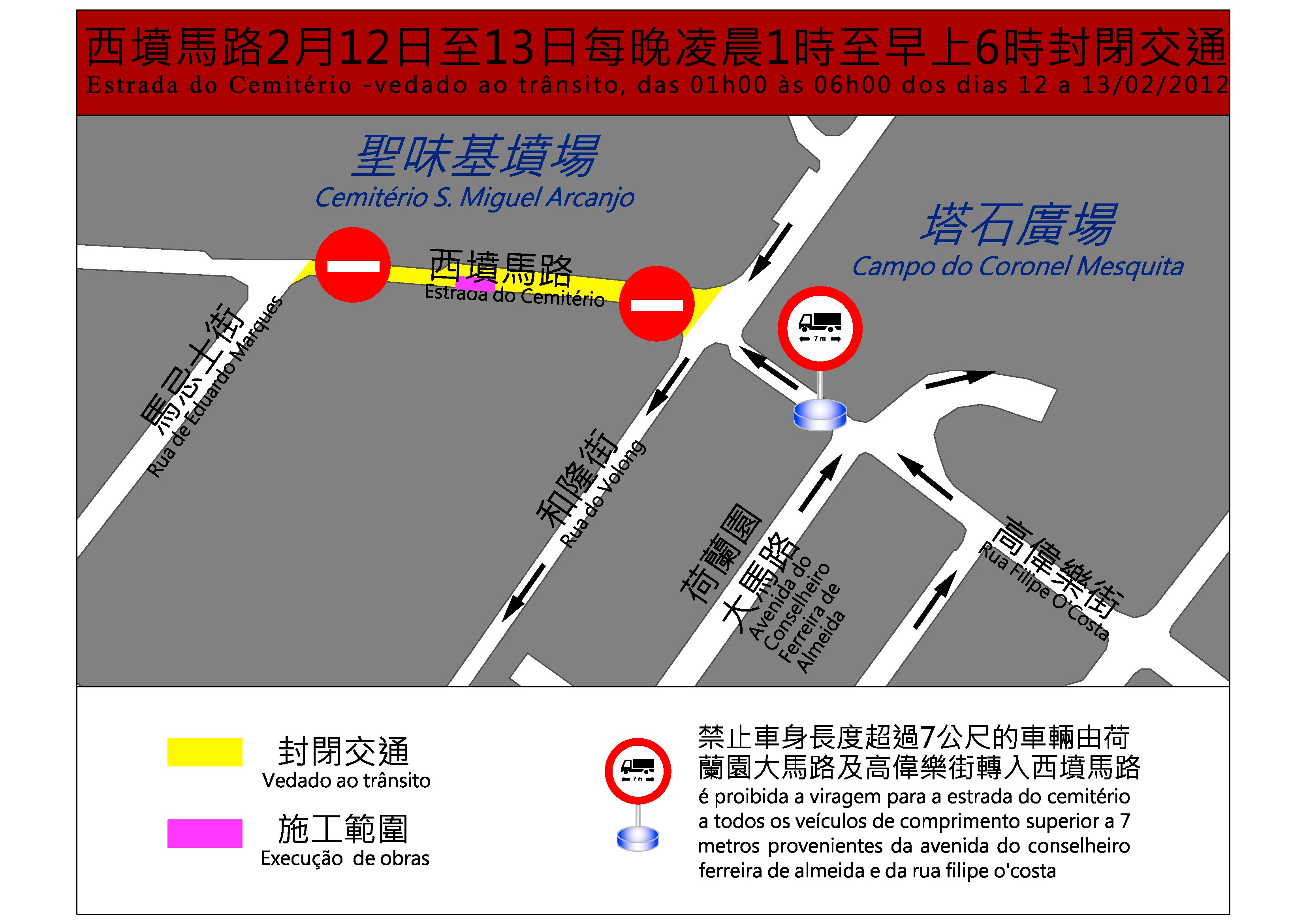 配合澳門自來水公司維修水管,介乎和隆街與馬忌士街之間的一段西墳馬路將於周日(12日)凌晨1時至翌日早上6時,一連兩日臨時封閉,屆時經塔石街、荷蘭園大馬路及高偉樂街行駛至工程範圍之車輛,需取道和隆街繼續行駛。期間,禁止車身長度超過7米的車輛由荷蘭園大馬路及高偉樂街轉入西墳馬路。交通事務局呼籲駕駛者留意,並遵守現場交通標示行車。