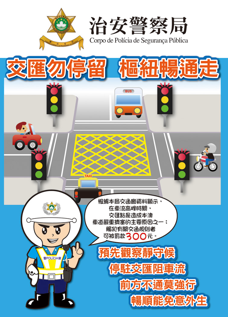 近年來,隨著車輛數量的上升,道路會車頻率相應增加,此情況尤其出現在車流集中的旅遊及商業區路段,若交匯點出現堵塞,往來道路必然受到連帶影響;針對有關情況,治安警局交通廳年內加強了在相關道路交匯點的執法工作。為作出配合,是日上午本局派出交通廳人員到約翰四世大路、殷皇子馬路、蘇亞利斯博士大馬路一帶進行宣傳活動,呼籲駕駛者注意遵守交通規則,切勿在交匯點停車。