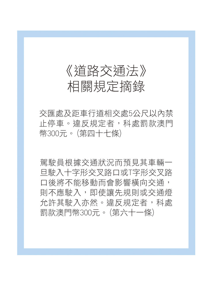 交匯點停車是違反《道路交通法》的行為,其一則阻礙他方行車道,造成淤塞連鎖交通路網;二則容易引發交通意外,對自身亦無好處。根據本澳《道路交通法》的規定,駕駛員根據交通狀況而預見其車輛一旦駛入十字形交叉路口或T字形交叉路口後將不能移動而會影響橫向交通,則不應駛入,即使讓先規則或交通燈允許其駛入亦然,違反規定者,可被科處罰款澳門幣300元。