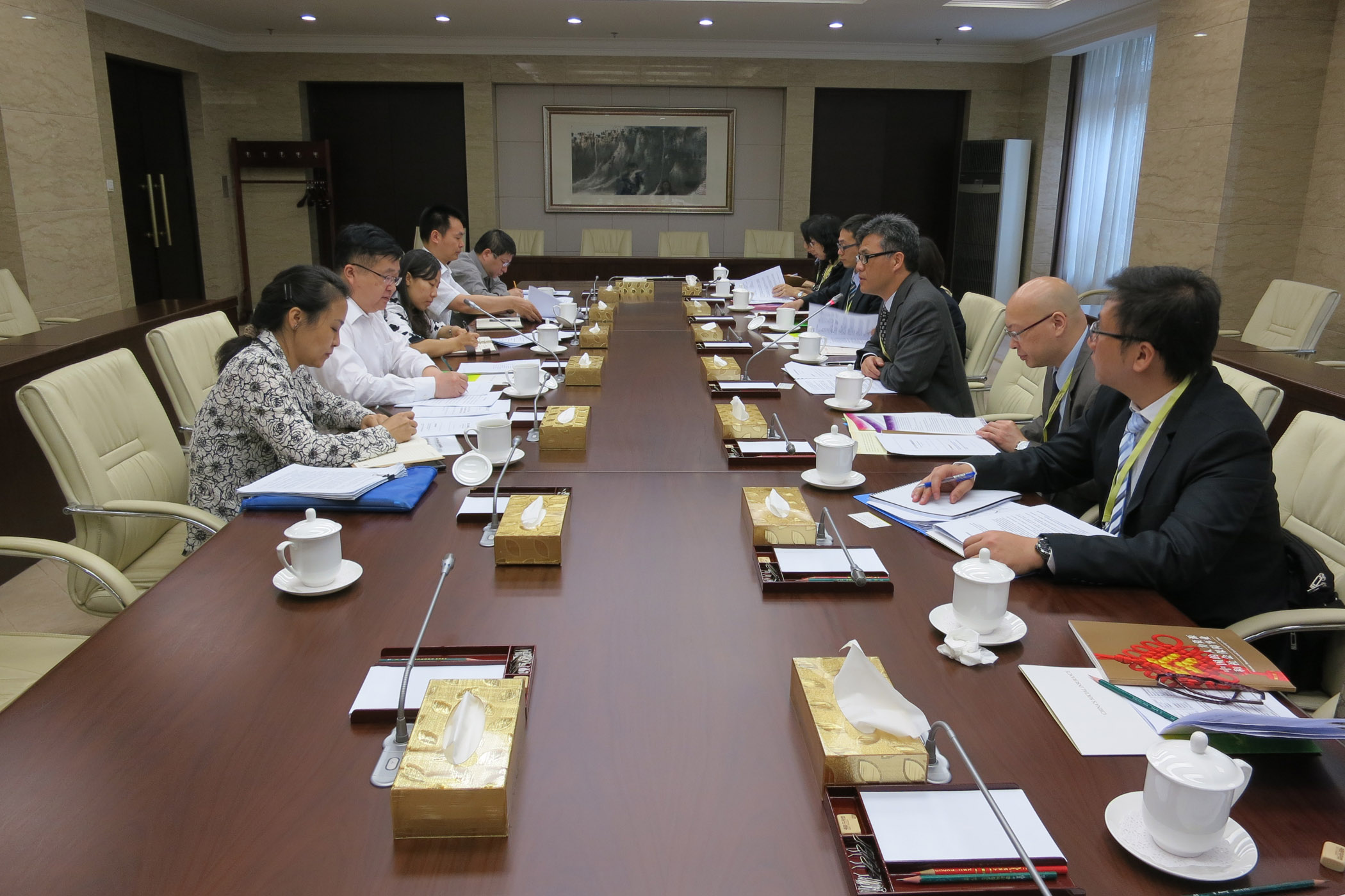 一行人於5月7日上午首先拜訪人社部,與社會保險事業管理中心副主任除延君等會面。人社部代表向考察團介紹內地社會保障制度概況。有關制度由基本養老保險、基本醫療保險、失業保險、工傷管理制度及生育管理制度組成,其中養老保險分為城鎮基本保險、新型農村養老保險及城鎮居民養老保險,人社部預計今年可實現基本養老保險全覆蓋的目的。而面對人口老化,未來除堅持實施「保基本、廣覆蓋、多層次、可持續」的養老保障制度外,亦會加強資金儲備及考慮延後退休年齡。關於內地與本澳社會保障體系銜接方面,人社部認為可先統一基本原則,並以合作較緊密的廣東省作示範,再按各地情況研究可行方案,日後雙方可就有關議題保持交流及討論。