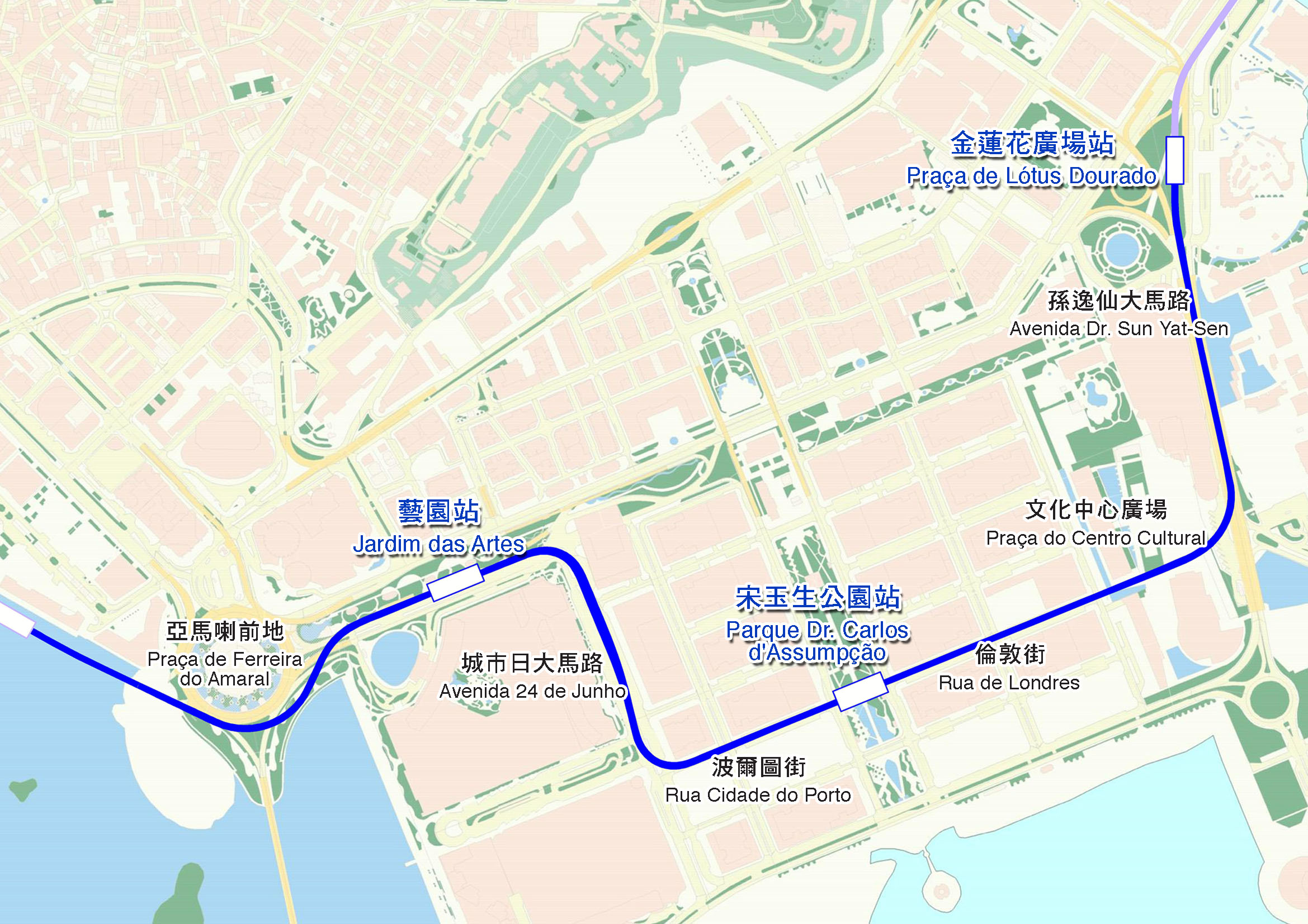 澳門輕軌系統新口岸段全長約2.4公里,以高架方式興建,設有:金蓮花廣場、宋玉生公園及藝園3個車站,由金蓮花廣場站起,途經孫逸仙大馬路、文化中心廣場、倫敦街、宋玉生公園、波爾圖街、城巿日大馬路、藝園及亞馬喇前地,服務範圍涵蓋新口岸區及皇朝區大部份區域,串連輕軌系統東北段及南西灣湖段,方便居民出行,亦有利宋玉生廣場一帶的商業大廈及學校在尖峰時段的人流集散。