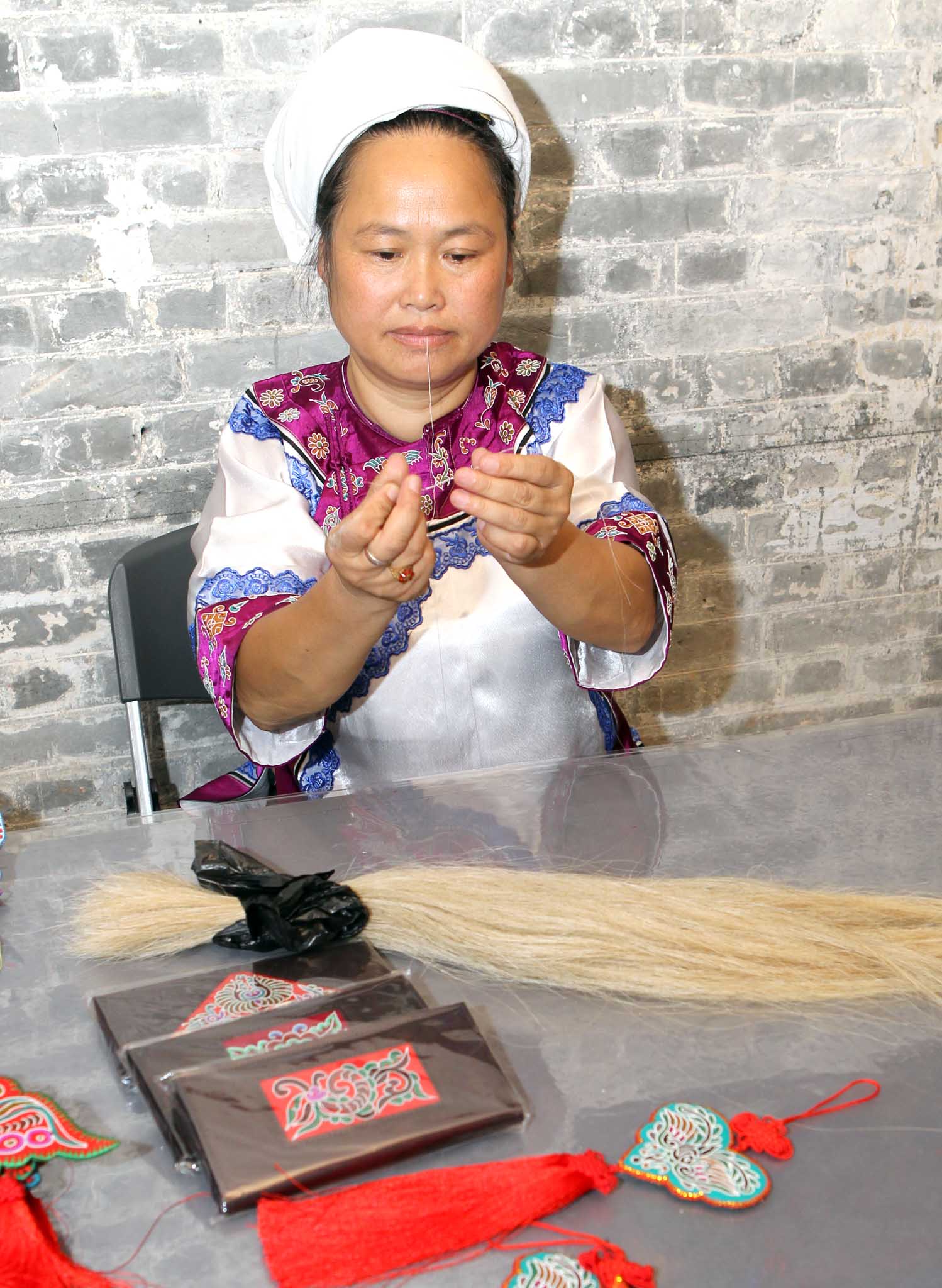 水族馬尾繡是水族婦女世代傳承的一種民間手工藝品,一般都由家族女性自然傳承,沒有文字記載,其獨特之處在於用絲線纏裹馬尾用於刺繡,針法有平繡、空心繡、挑繡、結線繡、螺形繡等,作品具有浮雕質感,遠遠望去宛若一幅彩色浮雕,被人們稱為“刺繡中的活化石” ,已列入國家級非物質文化遺產項目。宋水仙為省級非物質文化遺產項目代表性傳承人,高級工藝師,其製作的馬尾繡不但馬尾線搓得均勻,而且繡出的圖案立體性強,作品色彩鮮明、細密精緻、寓意吉祥。