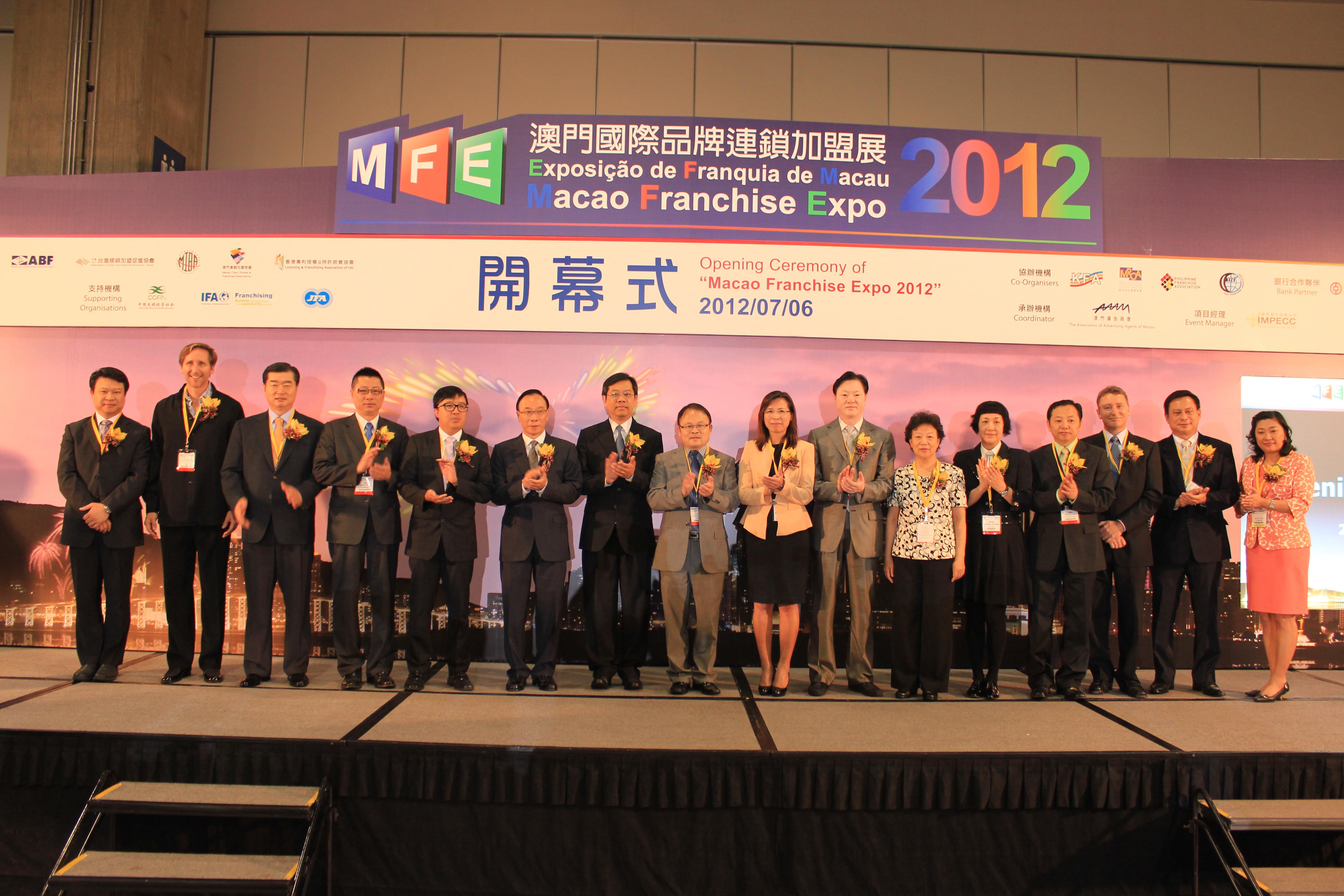 一連三日的“澳門國際品牌連鎖加盟展2012”(2012MFE),於今日(7月6日)假澳門威尼斯人-度假村-酒店展館D隆重開幕。活動由澳門貿易投資促進局、巴西特許經營商會、台灣連鎖加盟促進協會、澳門國際品牌企業商會、澳門連鎖加盟商會、香港專利授權及特許經營協會共同主辦;中國連鎖經營協會、國際特許經營協會及日本特許經營協會支持;韓國特許經營協會、馬來西亞連鎖商會、菲律賓特許經營協會、泰國特許經營協會協辦,並由澳門廣告商會承辦。今年大會以“品牌無限延伸 商機一觸即發”為口號,透過展覽、論壇、商業配對及產品/服務推介等形式,推廣國際特許經營、連鎖加盟、品牌代理等業務,加強本地品牌邁向國際,並進一步激勵青年人創業及本澳中小企升級轉型。此外大會亦安排了493場商業配對,簽約項目共15份。