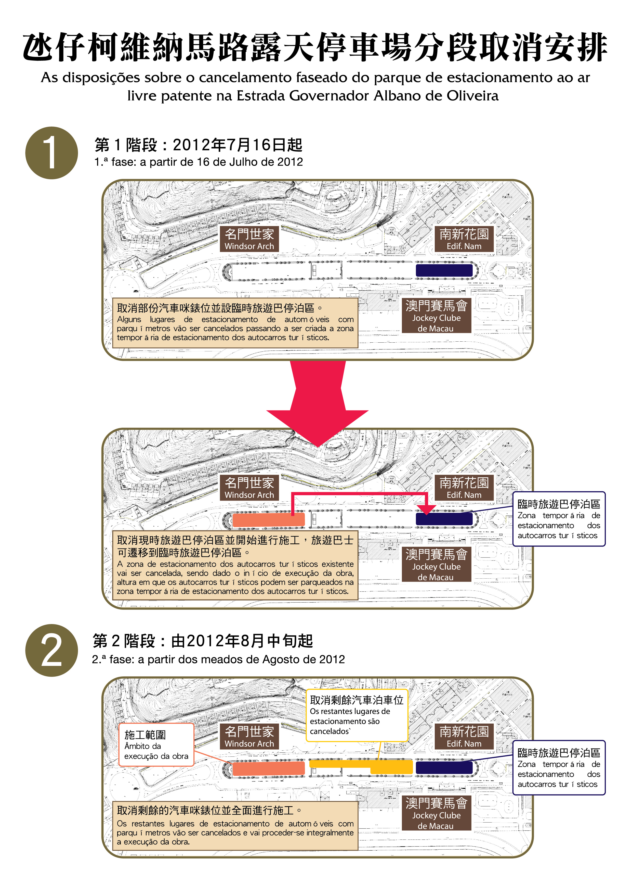 為配合氹仔柯維納馬路交通樞紐第一期建造工程,在儘量減少對公眾影響的原則下,運輸基建辦公室與交通事務局經研究該區整體狀況後,將分兩個階段取消賽馬會前地露天停車場共377個輕型汽車咪錶車位。首階段由周一(16日)開始,取消賽馬會前地共198汽車咪錶車位,並改設該範圍為臨時旅遊巴士停泊區,現時賽馬會前地的旅遊巴士停泊區會隨著臨時停泊區設立後停止使用。第二階段由8月中旬開始,屆時會取消賽馬會前地剩餘的179個汽車咪錶車位。當局期望透過分階段取消咪錶車位讓居民逐步適應,亦避免一次性全數取消帶來的不便。另外,交通事務局呼籲駕駛者留意以上安排,並建議上述停泊區取消後,駕駛者可轉往附近成都街的中央公園停車場停泊,該停車場設有1,384個電單車泊位及1,343輕型汽車泊位,收費為電單車每小時澳門幣1元,輕型汽車每小時澳門幣3元。