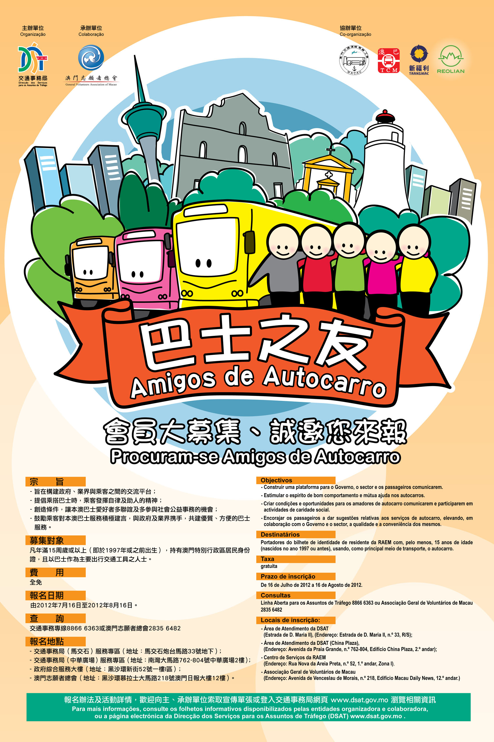 除「巴士之友」計劃外,「優質巴士服務,你我共同創造」系列活動還包括巴士司機選舉及巴士司機培訓計劃,詳情將於稍後公佈。公眾如對上述計劃有任何疑問,可登入交通事務局網頁www.dsat.gov.mo瀏覽詳情,亦可致電交通事務專線8866 6363或澳門志願者總會 2835 6482查詢。