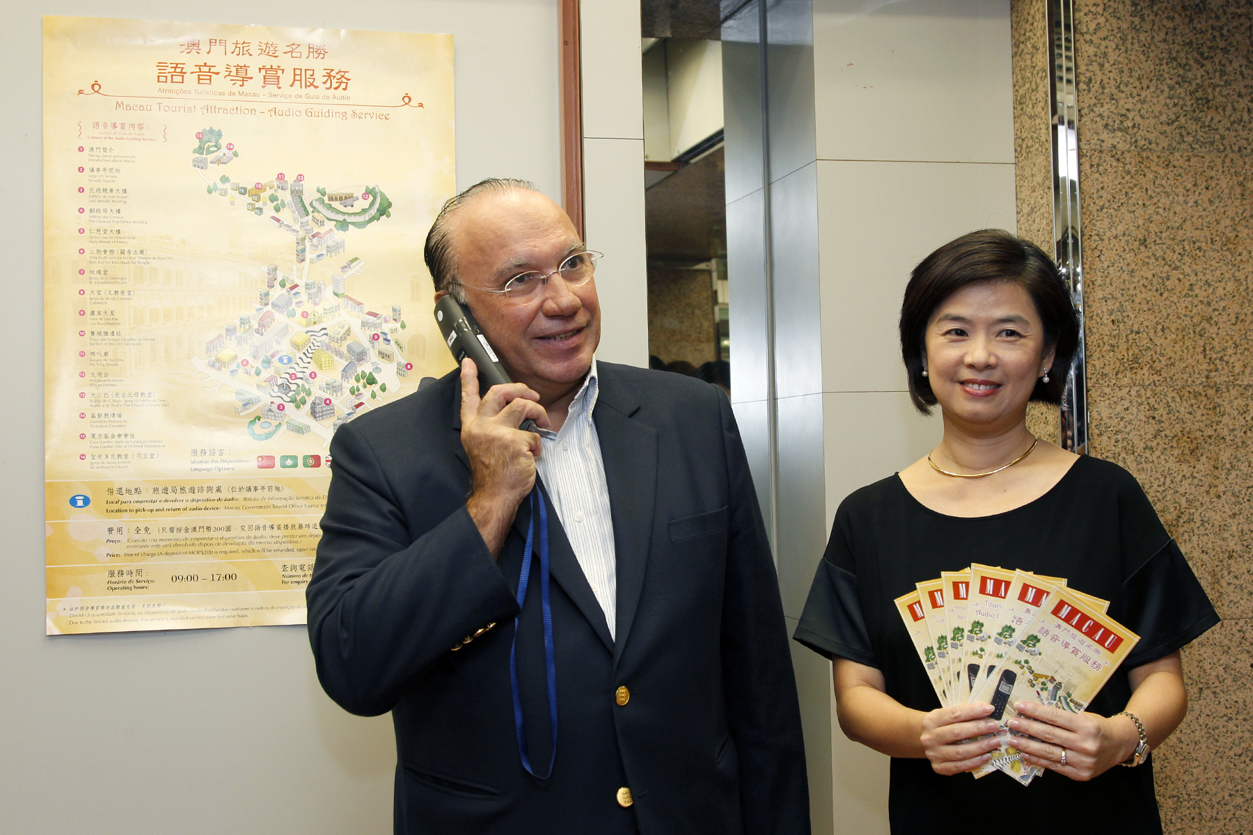 澳門特別行政區政府旅遊局本月27日起推出免費語音導賞服務,目的為照顧不同需要的旅客以及促進旅客對澳門世遺及景點的認識。旅遊局局長安棟樑陪同傳媒使用新服務。