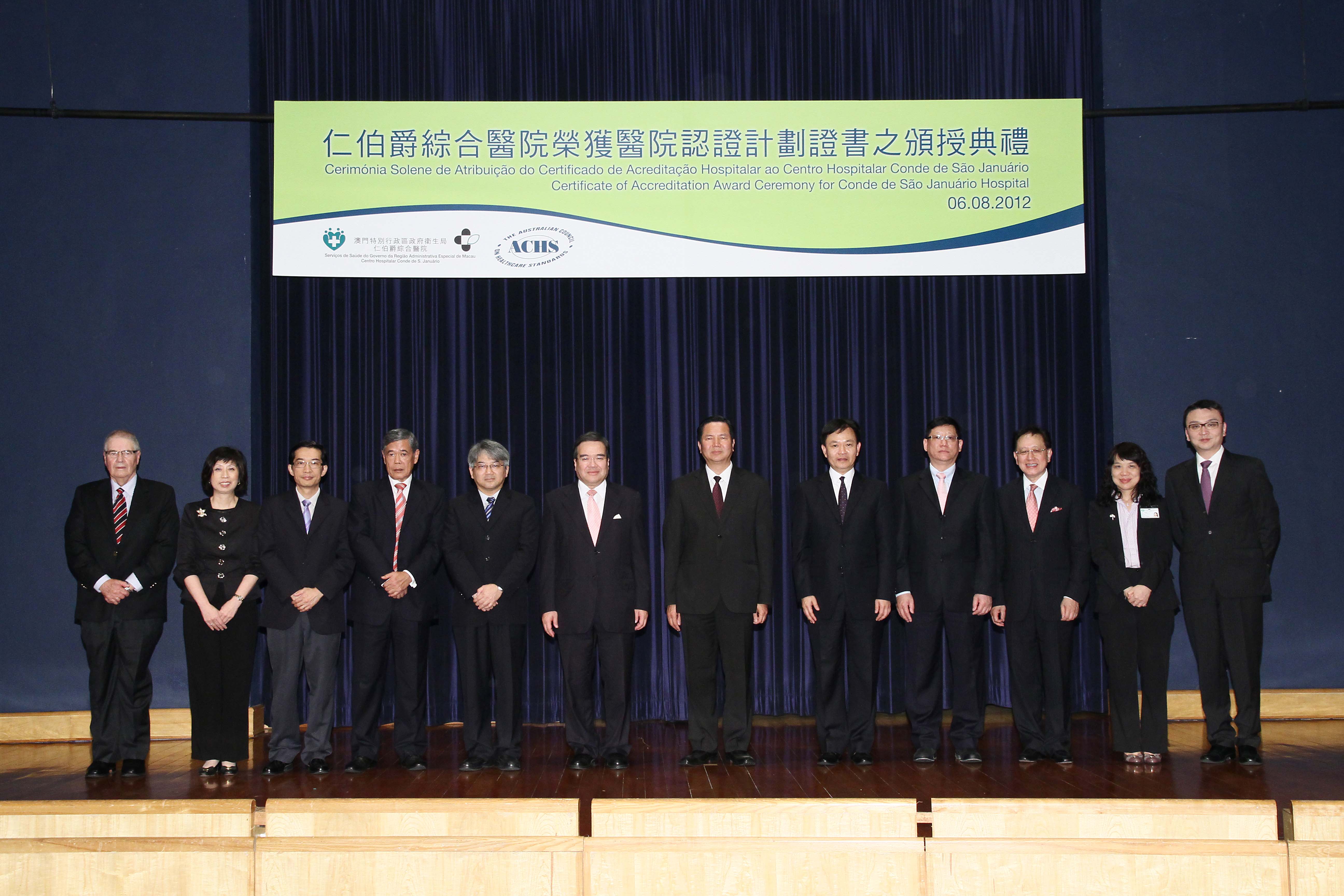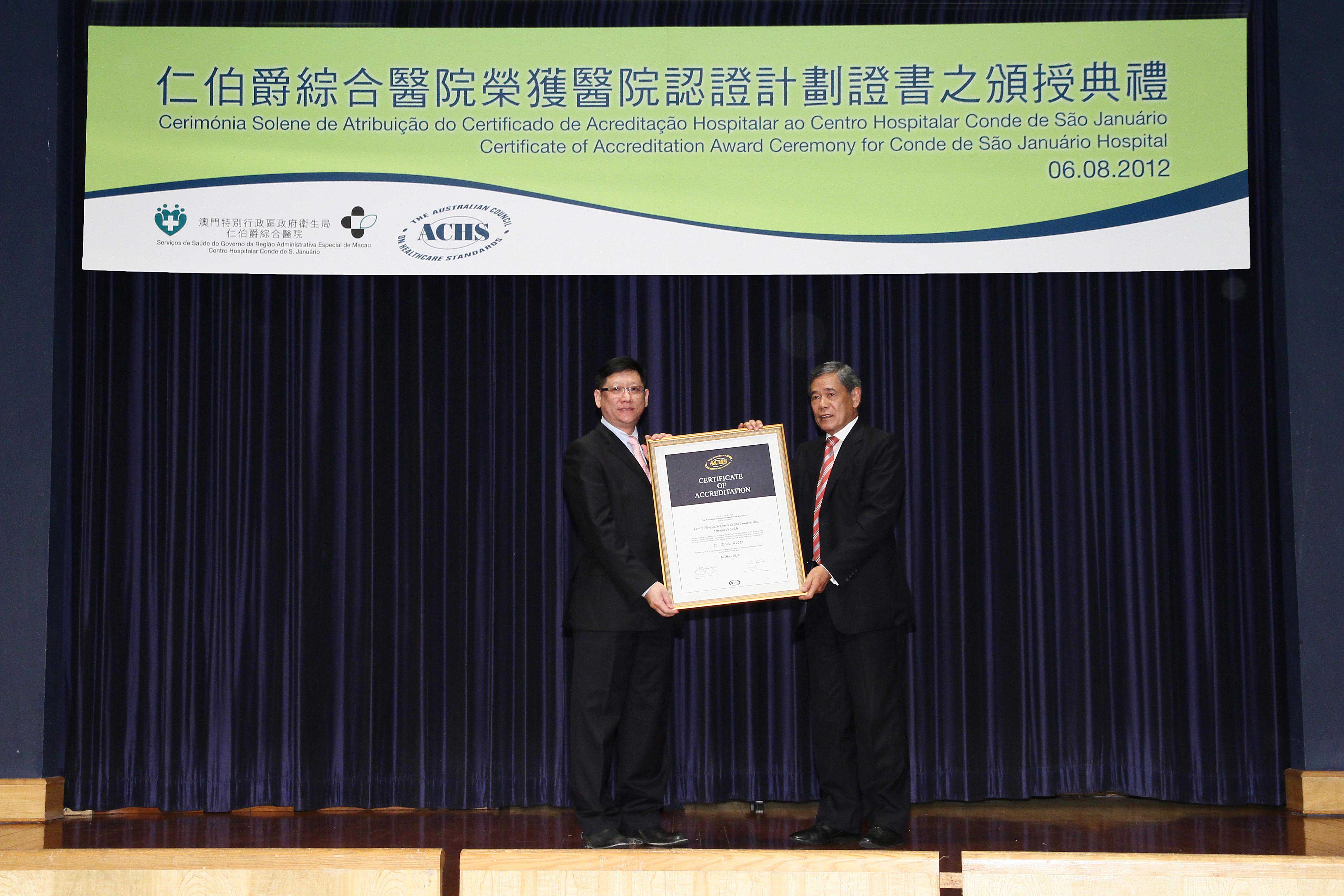 仁伯爵綜合醫院獲澳洲醫療服務標準委員會(ACHS)的評審認可,全數通過了45項準則的評審工作,獲頒發「為期4年的全面性認證」,其中預防壓瘡、預防病人跌倒和保安管理3項服務更取得「優異」評級。「仁伯爵綜合醫院榮獲醫院認證計劃證書之頒授典禮」於8月6日假衛生局行政樓大禮堂舉行。出席人員包括社會文化司張裕司長,香港醫院管理局胡定旭主席和梁柏賢行政總裁,澳洲醫療服務標準委員會Desmond Yen國際業務執行董事,衛生局李展潤局長,陳惟蒨、鄭成業和何鈺珊副局長等。