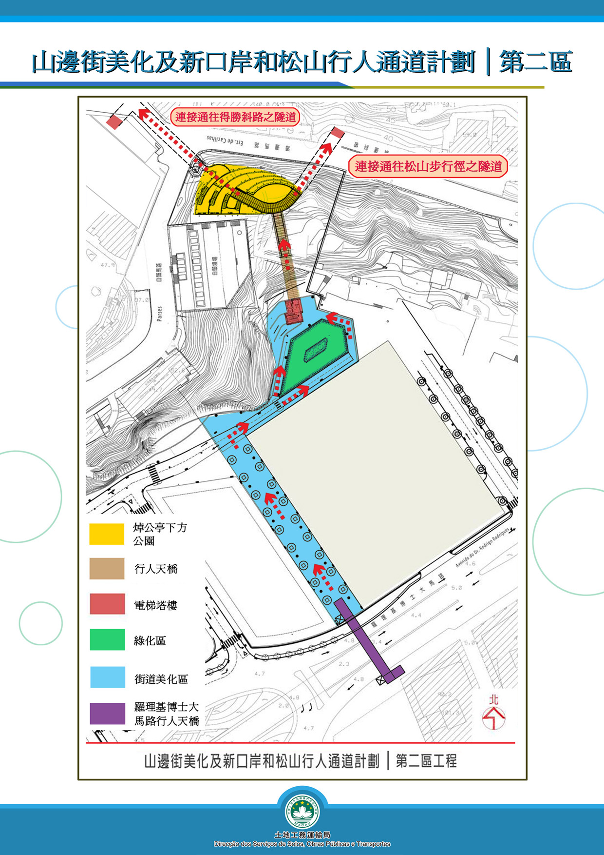 為構建一個和諧舒適的步行空間,其他工程包括設置綠化區、道路美化及山坡整治等亦同樣重要。至於第一區及第三區工程,土地工務運輸局將於適當時候展開招標的相關工作。