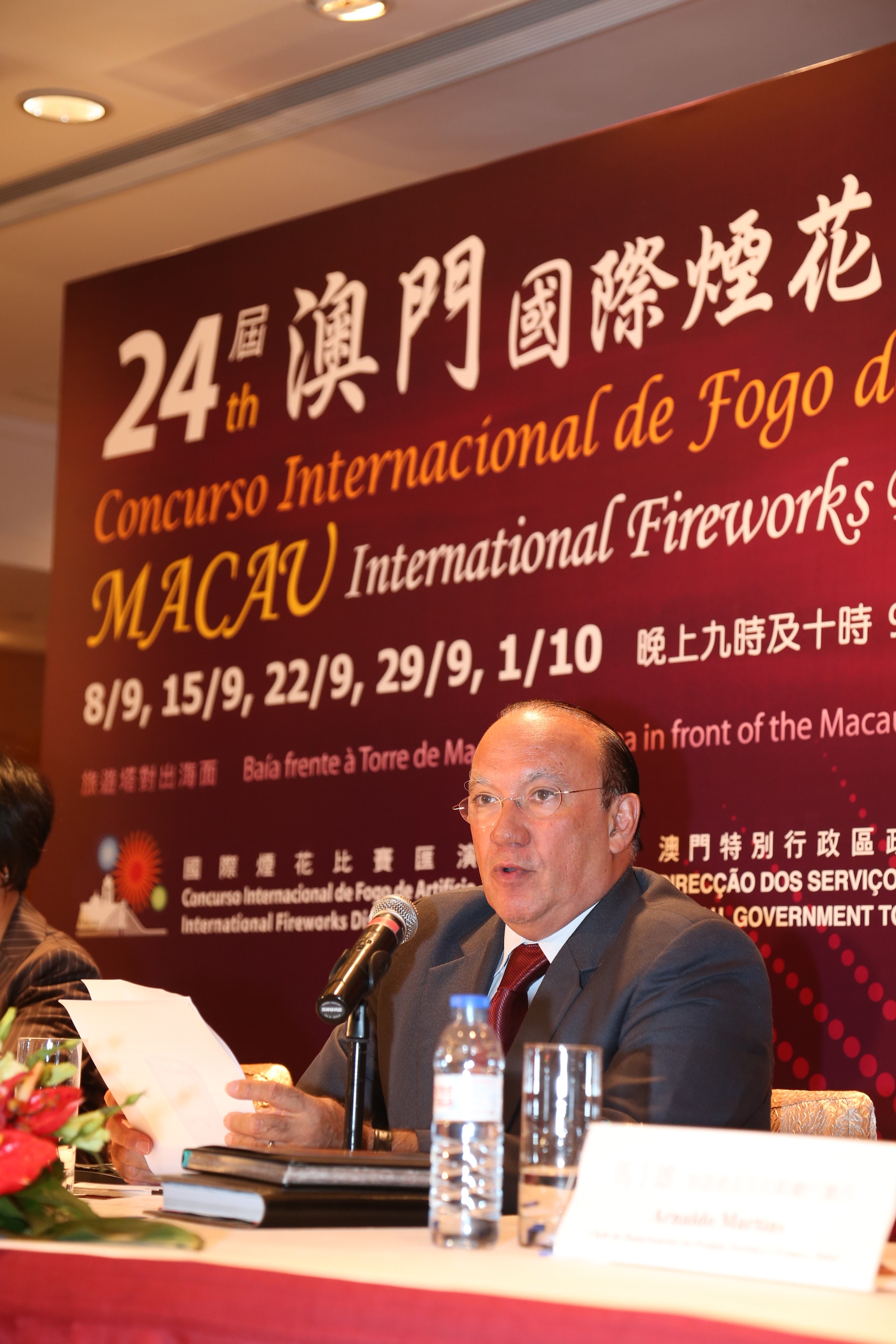 澳門國際煙花比賽匯演由澳門特別行政區政府旅遊局主辦,旅遊局局長安棟樑於記者會介紹本屆煙花比賽匯演情況。