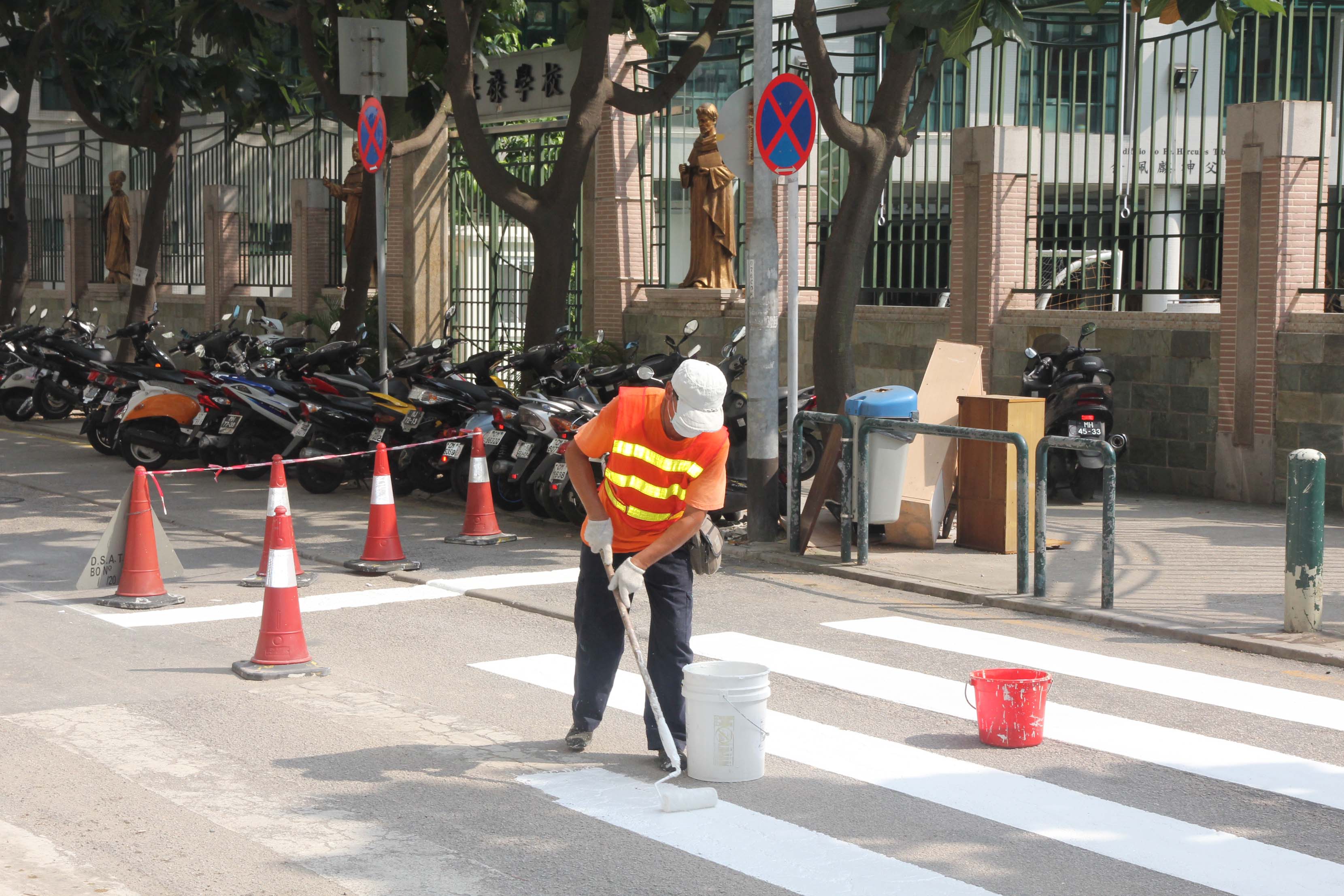 配合9月新學校開始,交通事務局早前對本澳各學校周邊道路進行視察,發現部份路面交通標線因使用時間長而出現褪色,局方已於本月20日起展開斑馬線、步行線、黃實線、黃虛線等交通標線的翻新工作。至目前為止,已完成青洲小學、福建學校、聖若瑟學校、聖德蘭學校、永援幼稚園、東南學校、廣大中學、坊眾學校、聖保祿學校、理工學院、沙梨頭浸信學校、商業學校及聖瑪沙利羅學校共13所學校標線的翻新。下周開始,將繼續有序於慈幼學校、菜農學校、黑沙環坊眾學校、新華學校、高士德大馬路及賈伯樂提督街近培正學校、雅廉訪大馬路、連勝馬路及羅若翰神公街近嘉撒聖心英文中學、水坑尾、殷皇子大馬路、新馬路等路段進行交通標線翻新工作,施工期間,有關路段將實施有限度通車。