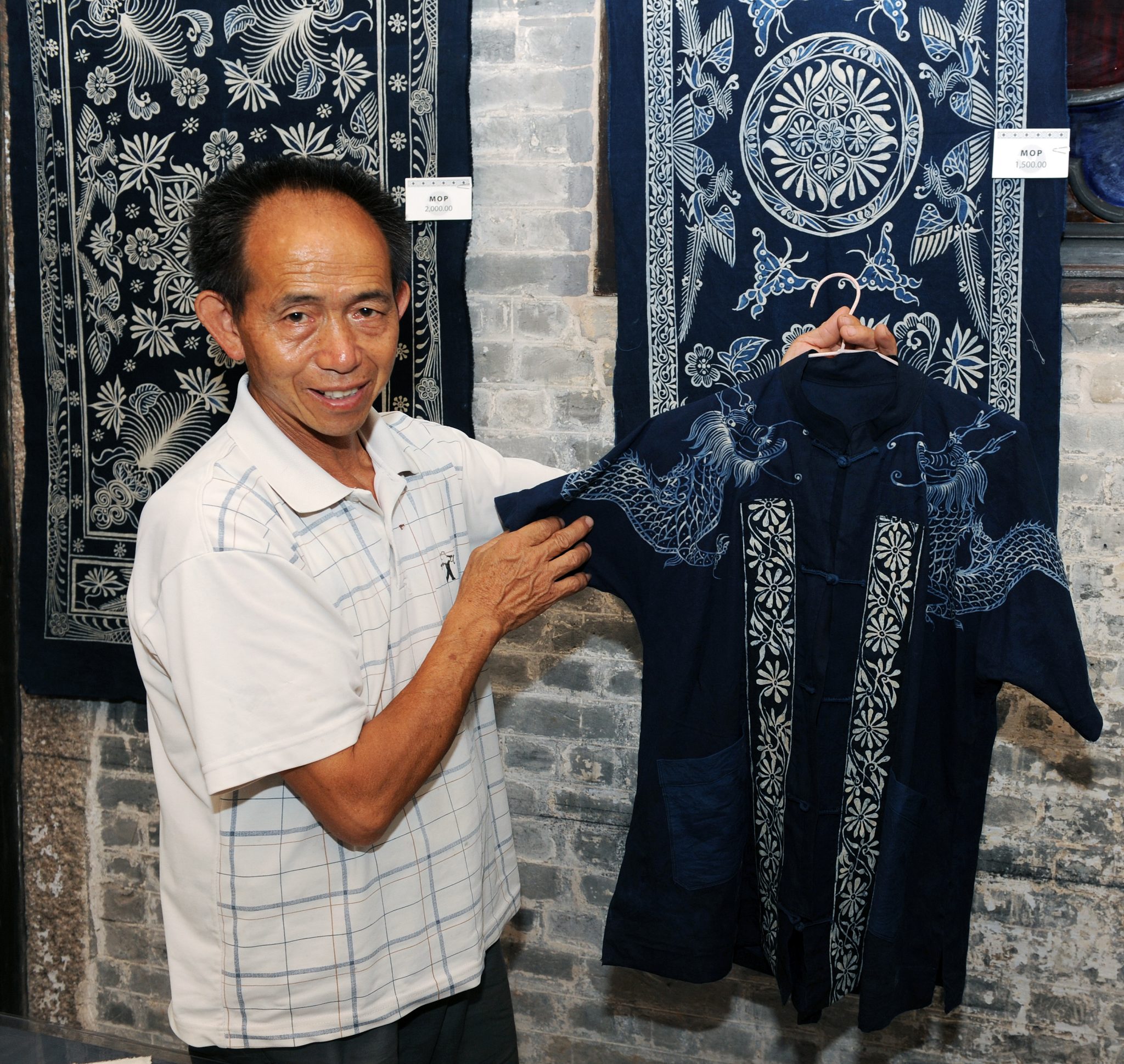 此外,布依族的楊光成同時來澳展演國家級非遺──惠水“楓香印染技藝”,該技藝歷史久遠、文化內涵豐富,手工技藝自成體系,圖案設計精美,古樸素雅,反映了惠水縣雅水鎮及周邊地區少數民族生產方式和生活習俗,百餘年來傳承不息。楊光成繼承了傳統繪畫圖案,同時大膽進行創新,其創作的楓香印染作品形式多樣,圖案造型精美,運筆線條流暢,蘊含著豐富的文化內涵,造型變化紋樣穿插和青底藍白花的外在形式美,與明朝青花瓷器圖案裝飾效果有異曲同工之妙,作品《牛油楓香染》榮獲貴州省十大民間工藝美術精品獎。