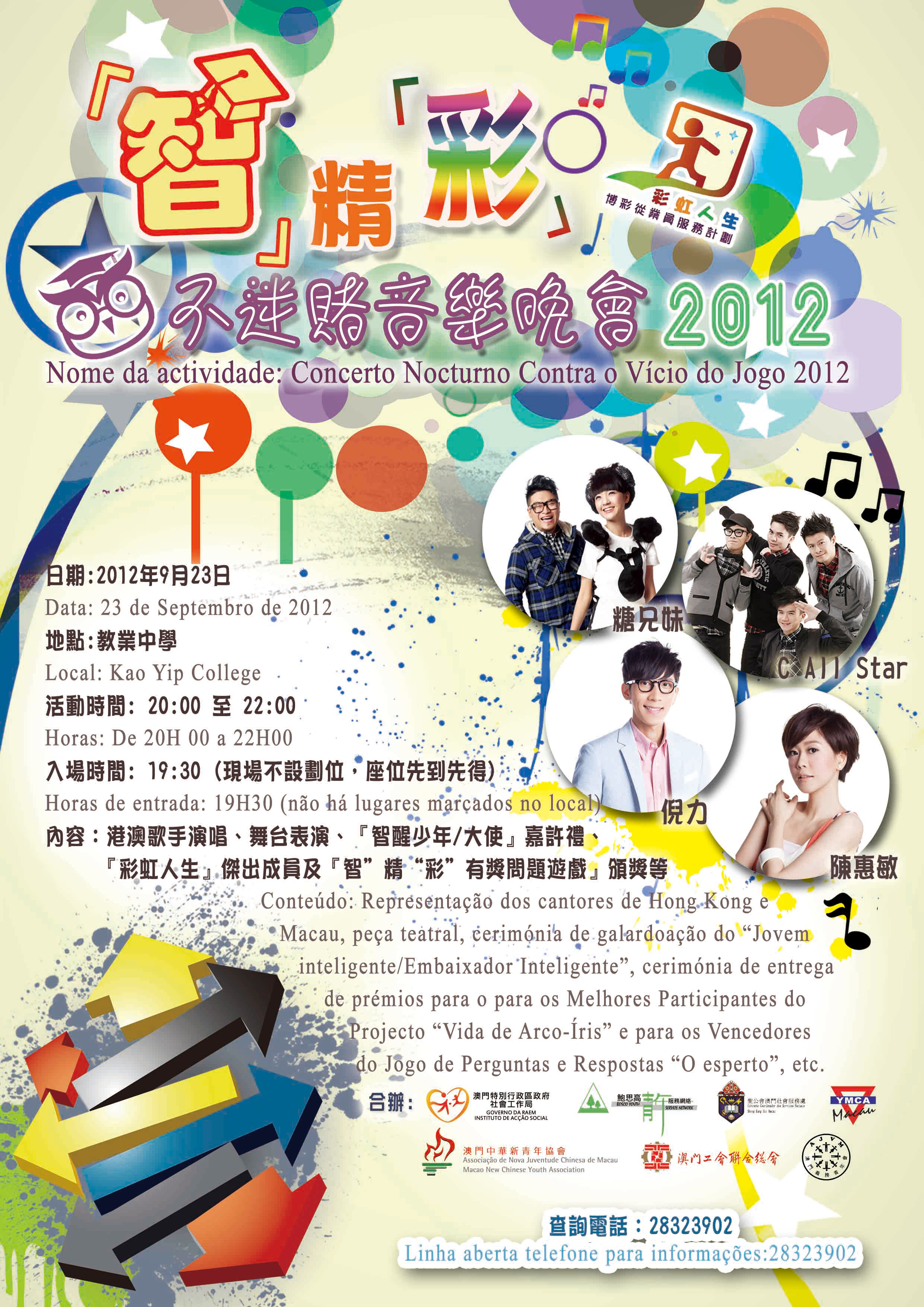 “智”精“彩”不迷賭音樂晚會旨在推廣預防沉迷賭博的訊息,推動及鼓勵市民參與健康的生活模式。晚會當日將公開表揚及嘉許各參與「智醒計劃」及「彩虹人生」活動的義工,同時安排了各項表演節目,包括有本地歌手倪力及陳慧敏、香港歌手糖兄妹及C ALL STAR表演助興,歡迎市民踴躍參加。音樂會門票於本月12在下列地點免費派發,每位市民限取兩張門票,派完即止。如有查詢可致電社會工作局志毅軒(電話28323902)查詢。