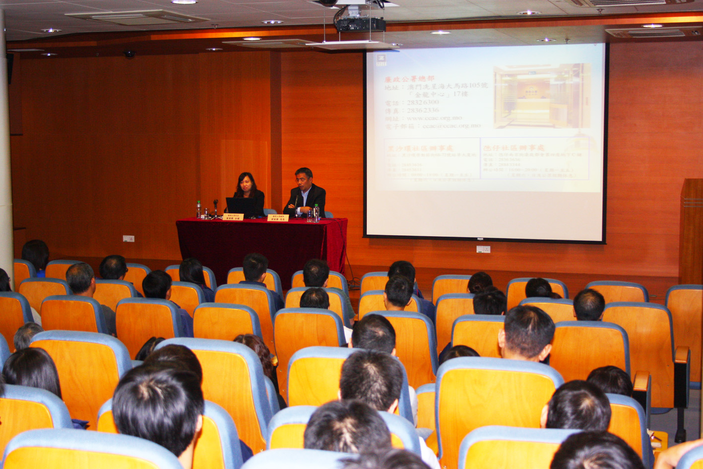 會上,廉政公署代表介紹了本澳的防貪法律制度,並結合實例及相關短片之個案,闡釋公務人員如何預防在日常工作中可能出現之受賄等犯罪情況,包括在招標、開標及評標期間之注意事項,以及什麼情況下需要利益申報及進行迴避,以免因誤解引致違法行為產生,並呼籲公務人員在工作過程中重視廉潔精神。