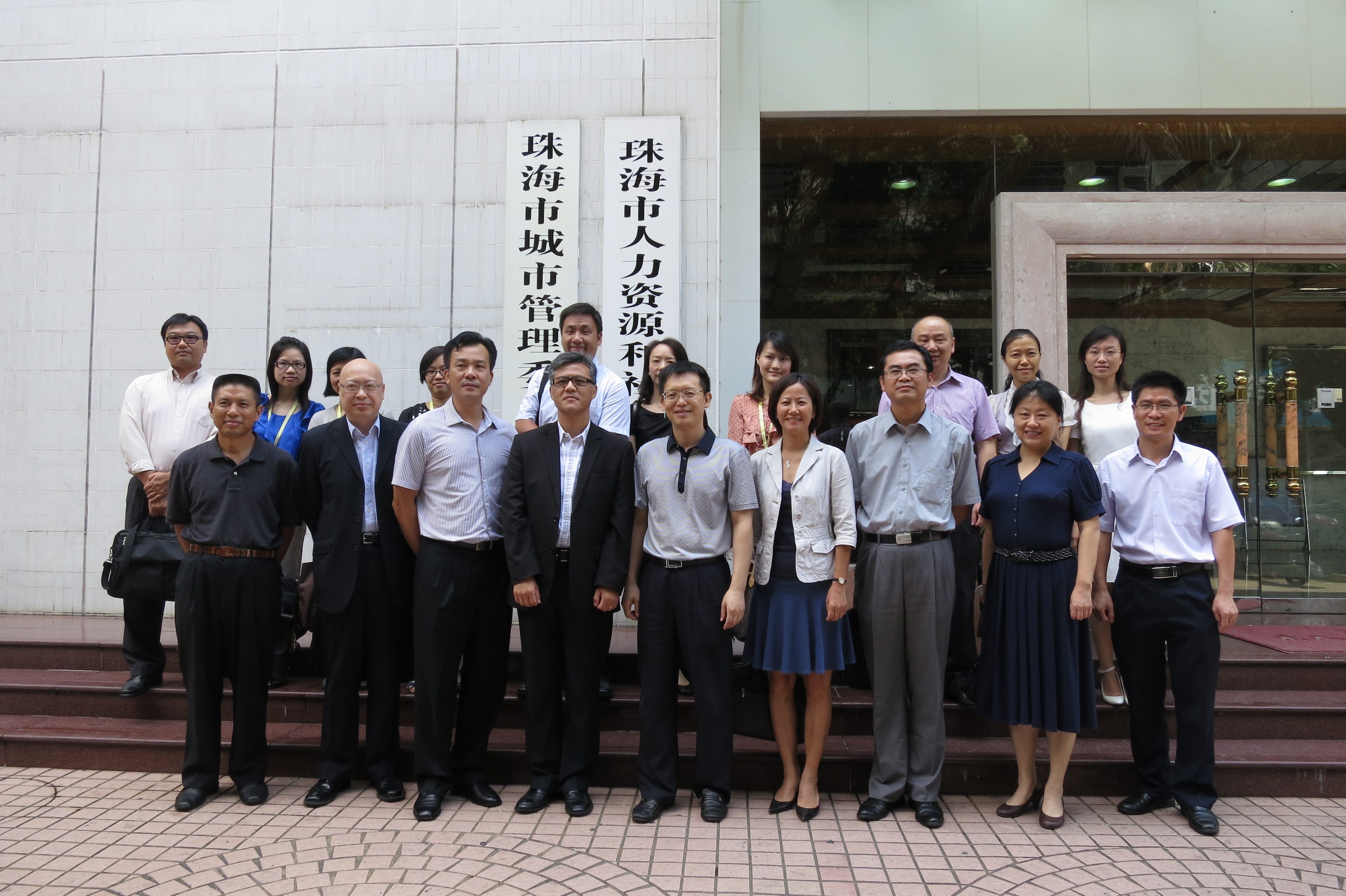 一行人翌日上午抵達珠海市人社局,與副局長吳少強、養老保險科等領導進行會議。人社局代表介紹,珠海市社會養老保險體系以職工基本養老保險、企業年金及商業險組成,另輔以新型農村及城鎮居民兩種社會養老保險支持沒有經濟能力的農民和城鎮非從業人員的養老保障。其中職工基本養老保險的繳費標準為用人單位繳納職工工資總額的10%,職工(或個人)則繳納上月工資的8%。用人單位繳納的供款用以支付當期退休人員的養老金,即下一代養上一代;職工(或個人)繳納的供款則累積用以日後支付自己的養老金。代表團其後亦參觀了珠海市社會保險業務經辦窗口的前線服務。