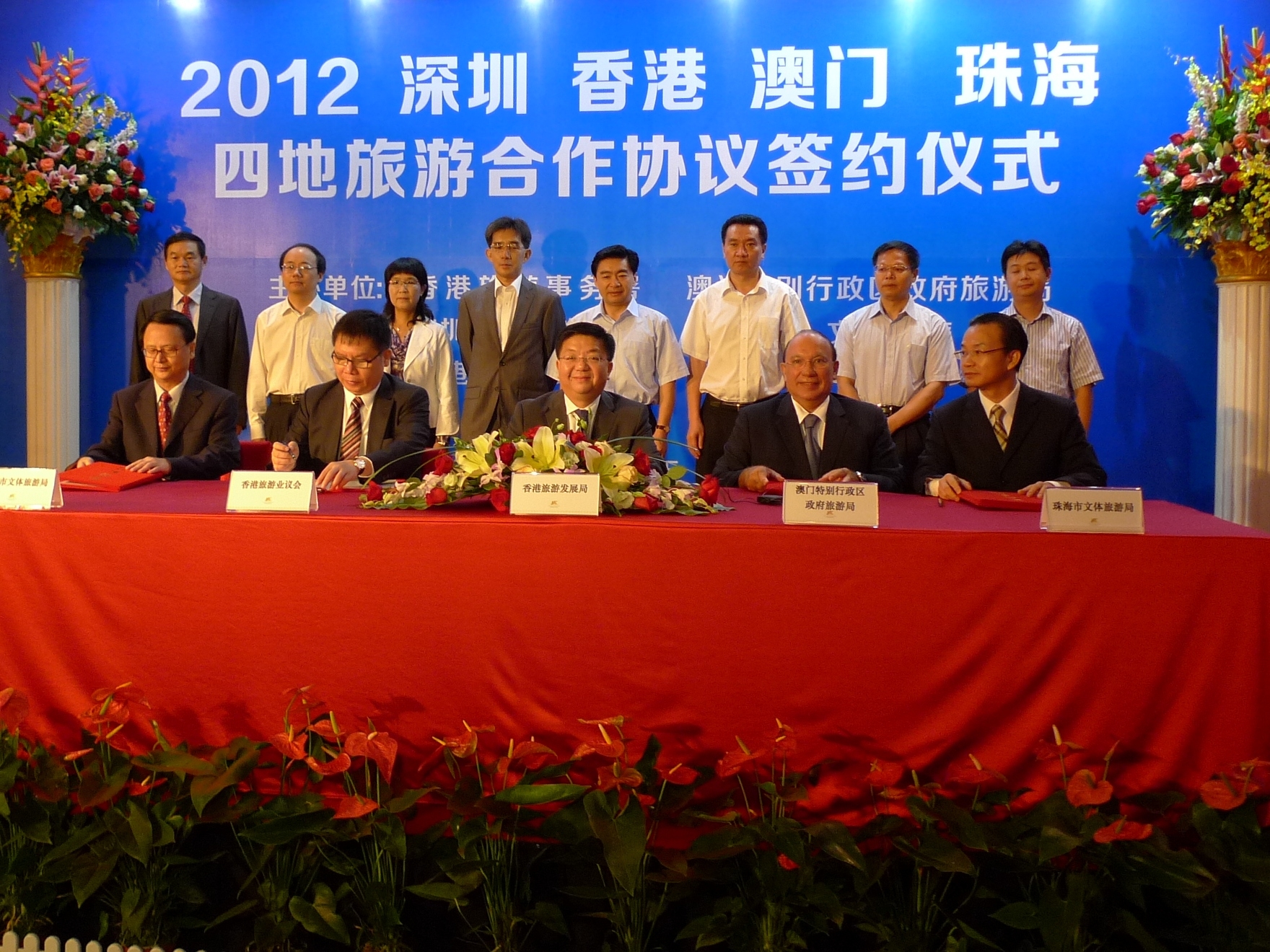 在深圳市市委書記王榮、深圳市市委秘書長李華楠、深圳市市政府副秘書長黃國強、亞洲旅遊交流中心(國家旅遊局香港澳門辦事處)主任徐惠芳、廣東省旅遊局副局長梅其潔,以及香港特別行政區政府旅遊事務專員容偉雄等見証下,澳門特別行政區政府旅遊局局長安棟樑、香港旅遊發展局總幹事劉鎮漢、香港旅遊業議會主席胡兆英、深圳市文體旅遊局局長陳威及珠海市文體旅遊局黨組書記張梅生於本月25日在深圳簽署首份《深港澳珠四地旅遊合作協議》。
