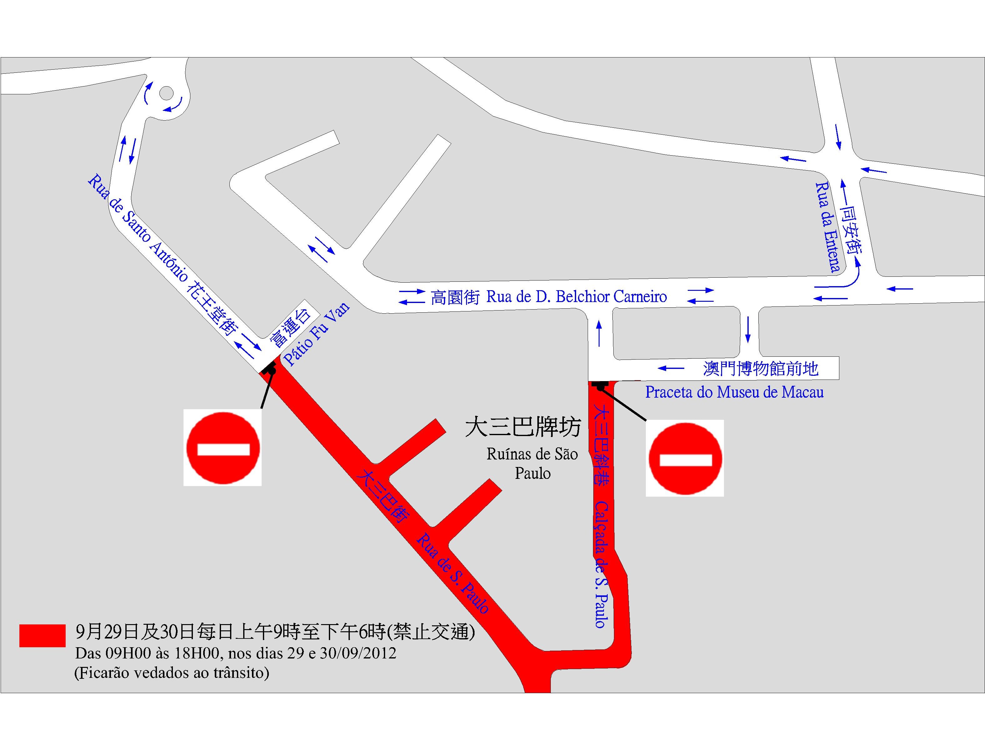 配合大三巴有慶祝中秋節活動舉行,周六(29日)、周日(30日)每日上午9時至下午6時,大三巴巷、大三巴斜巷及大三巴街部份路段將實施臨時封閉交通,禁止車輛駛進。同時,介乎澳門博物館前與高園街之間的一段大三巴斜巷則改為反方向行車,即車輛須由澳門博物館前地往高園街方向行駛。交通事務局呼籲公眾留意。