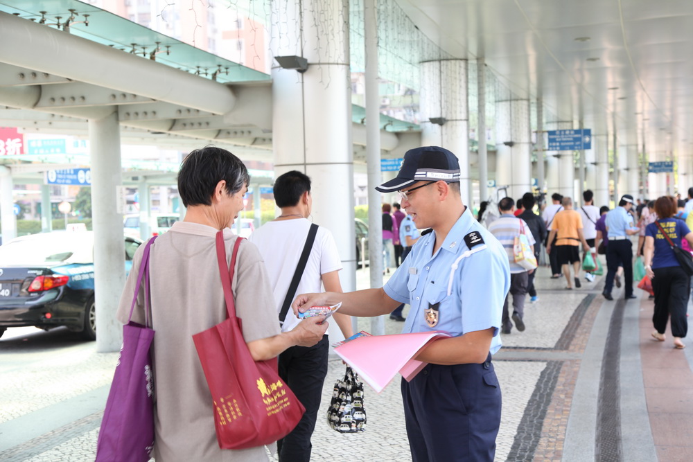 另一方面,宣傳小隊亦同時派發提防小手單張帶出防盜訊息,今年首8個月,本局錄得盜竊案整體有逾10%的跌幅,其中巴士上的盜竊案呈36%的大幅下跌,正面反映了警方的打擊行動。然而面對竊匪狡猾,各方不應鬆懈,黃金周期間或會轉移目標到人多擠擁的旅遊區,故商戶旅客應謹記管好財物;外遊居民亦應檢查家居防盜措施,鎖好門窗,避免擺放大量貴重物品於家中,本局會一連兩日以防盜竊為題到本澳旅遊區進行宣傳,以期在黃金週開始前重喚市民旅客防盜的意識,渡過安全愉快的假期。