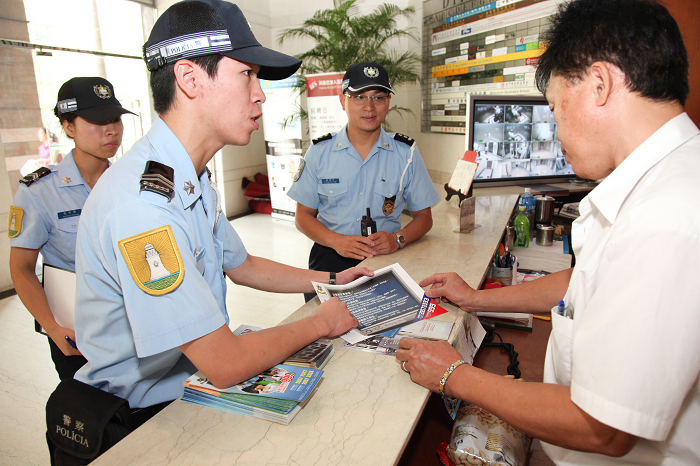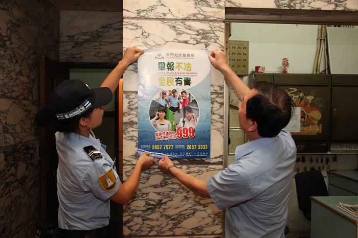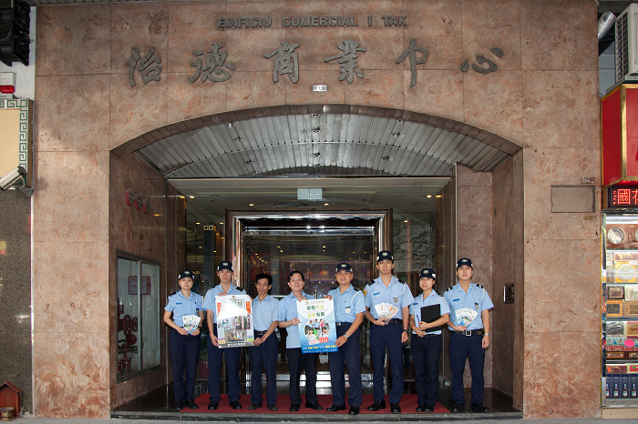 近年本澳商業活動愈見頻繁,商業樓宇亦較以往更有可能成為盜賊光顧的對象,本局對民居與商廈的安全同樣予以高度重視。今日上午,治安警察局公關處副警司黃超文率社區宣傳隊到新口岸一帶進行滅罪宣傳,目的在第四季加強包括商業大廈在內的管理員的防罪意識,做好相關預防工作。