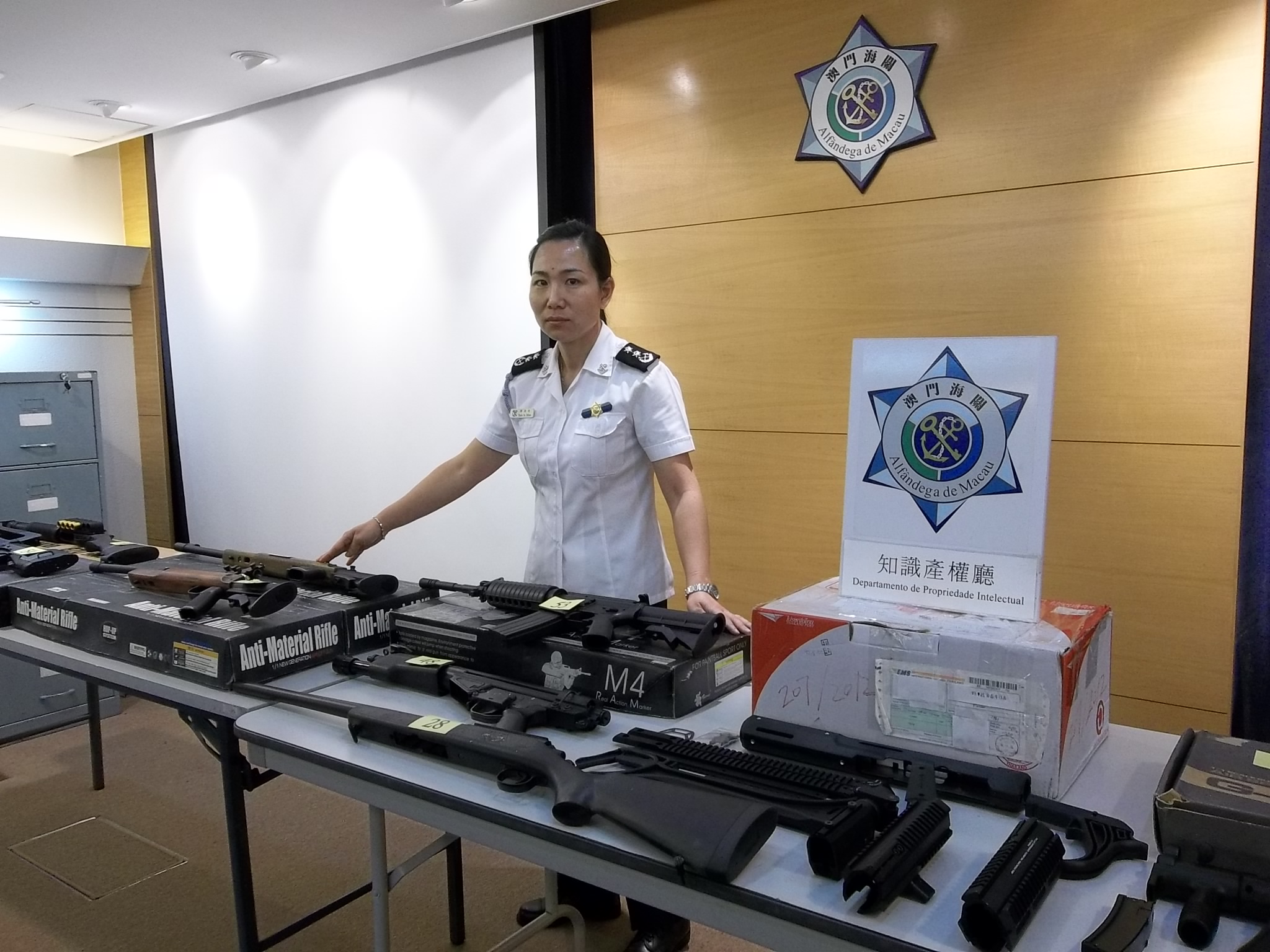 調查期間,發現兩個郵包內藏有未經申報入口的仿真槍械零件及螺絲配件等合共三十件,提貨女子姓陳,本澳居民,為某野戰用品專門店職員,受持牌人指使到郵局取貨。調查人員立即順藤摸瓜,在得到治安警察局情報廳,及其槍械暨彈藥科全力支援下,海關調查人員到澳門中區和北區共三個地點採取突擊行動,調查並扣押另外四十九枝長、七枝短,合共五十六枝仿真槍械。經檢測後,證實上述物品均列為第七七/九九/M號法令核准之《武器及彈藥規章》的受管制物品,五十六枝仿真槍械其動力焦耳量在0.9j至1.9j之間。其中八枝未能提供進口准照,故連同兩郵包合共三十八件物品,根據第七/二零零三號法律《對外貿易法》有關規定,宣告歸澳門特別行政區所有,涉案店舖並需繳交按海關關長批示所決定的罰款予政府庫房。