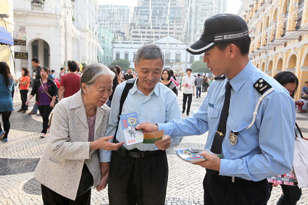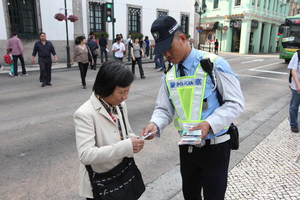 今天上午,本局公共關係處警司劉小俠連同澳門警務廳人員一行人到議事亭前地、板樟堂及大三巴牌坊一帶進行防扒及店鋪防盜宣傳活動。期間,宣傳隊向居民及遊客派發 “提防小手”小冊子,講解常見的犯罪手法,並即場對財物外露的人士作出溫馨提示,讓其了解正確保管財物的方法;亦向周邊商鋪進行防店鋪盜竊宣傳,提醒店員賊人的作案手法,特別在人多擠迫的時候提高警覺,以及適時提醒顧客注意個人財物安全。